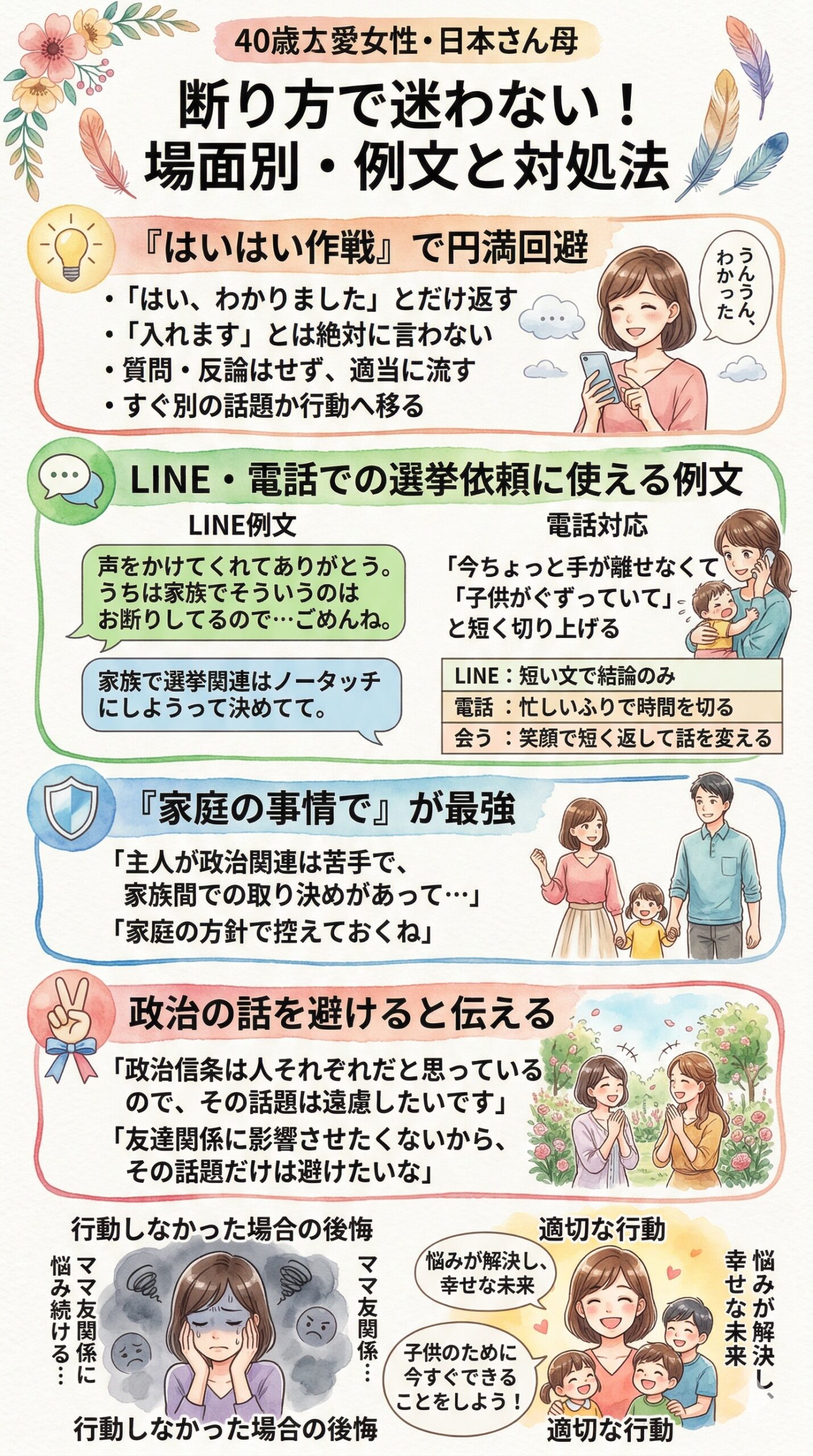4. ママ友の選挙勧誘をどう断る?LINE・電話・直接の例文と角を立てにくい対処法を整理
