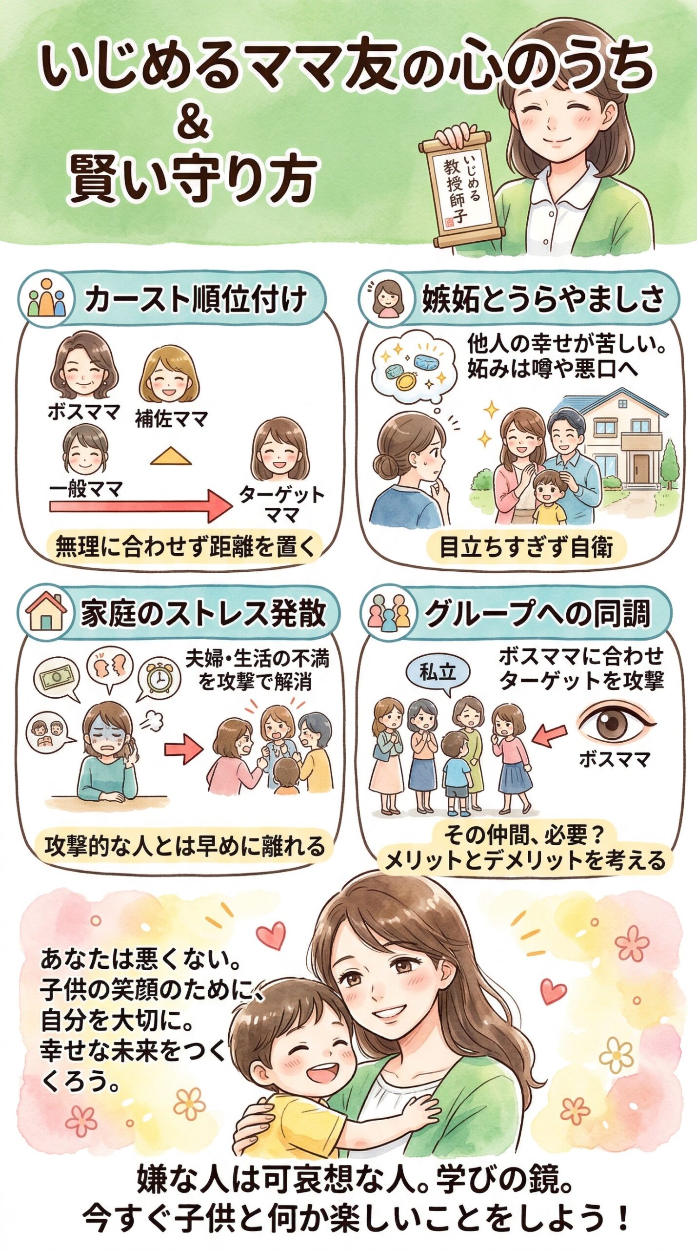 このページでは、いじめのターゲットになりやすい特徴・いじめるママ友の本音・そして今日から使える対処法を、経験者の視点からまとめています。