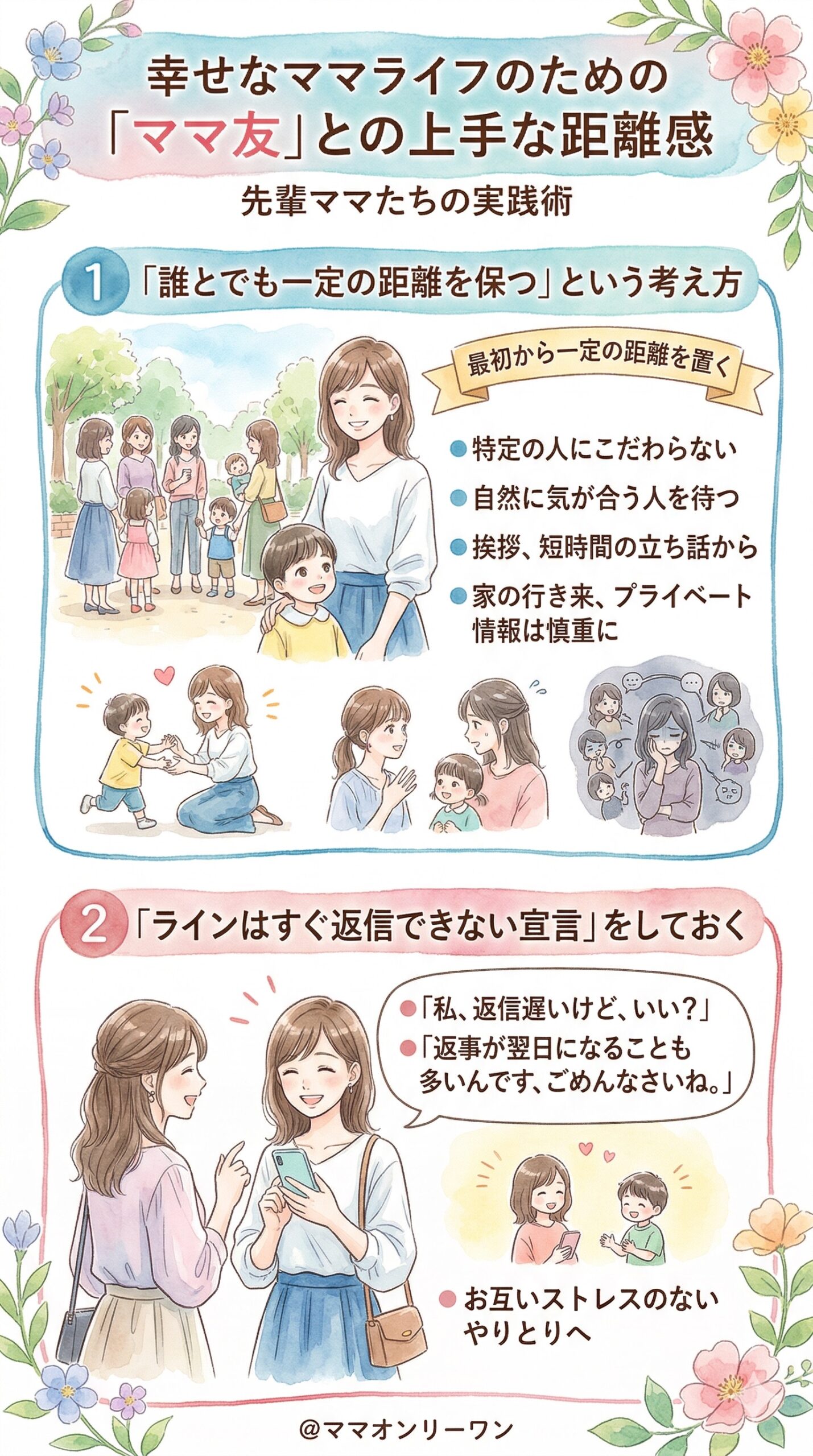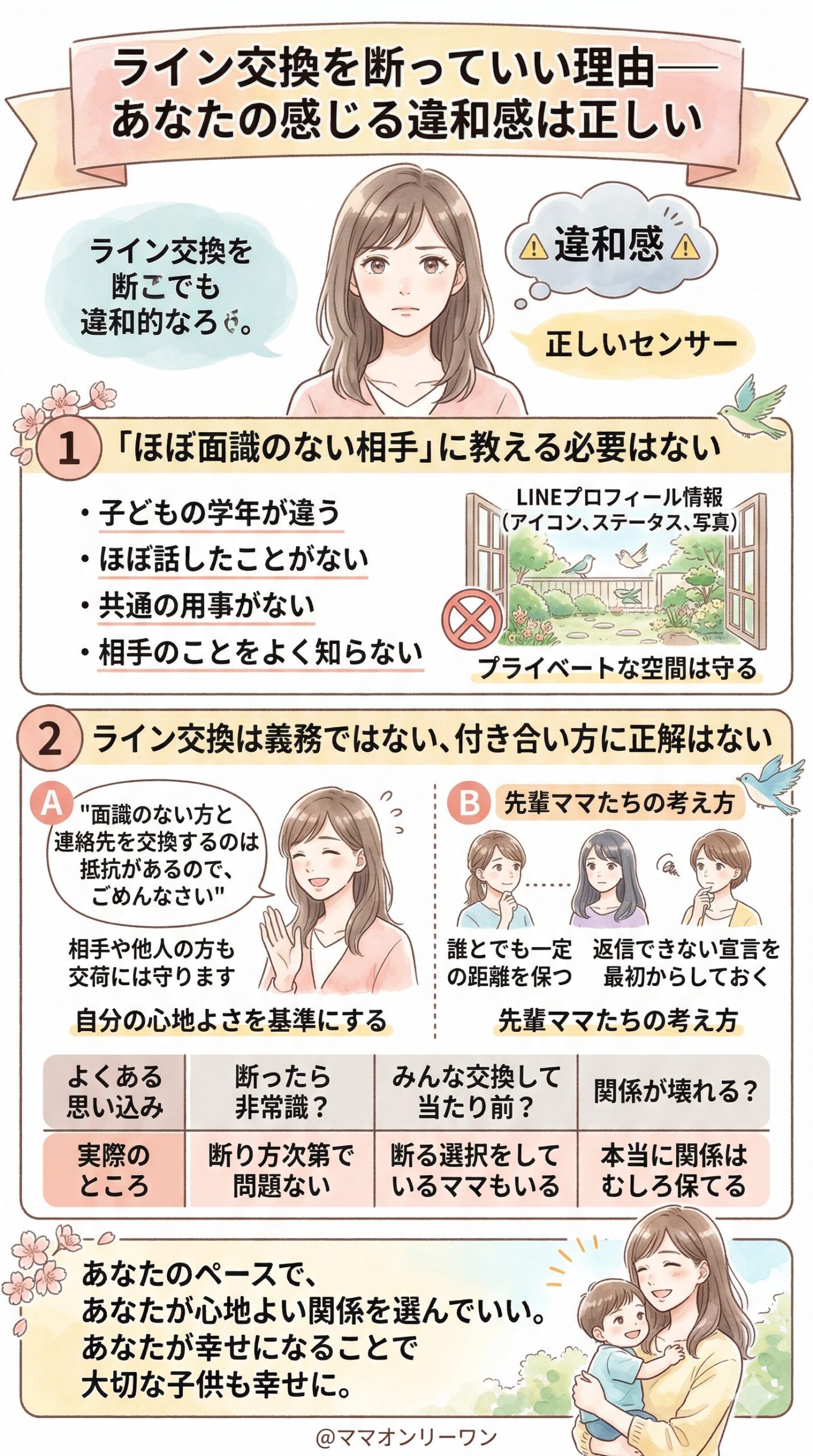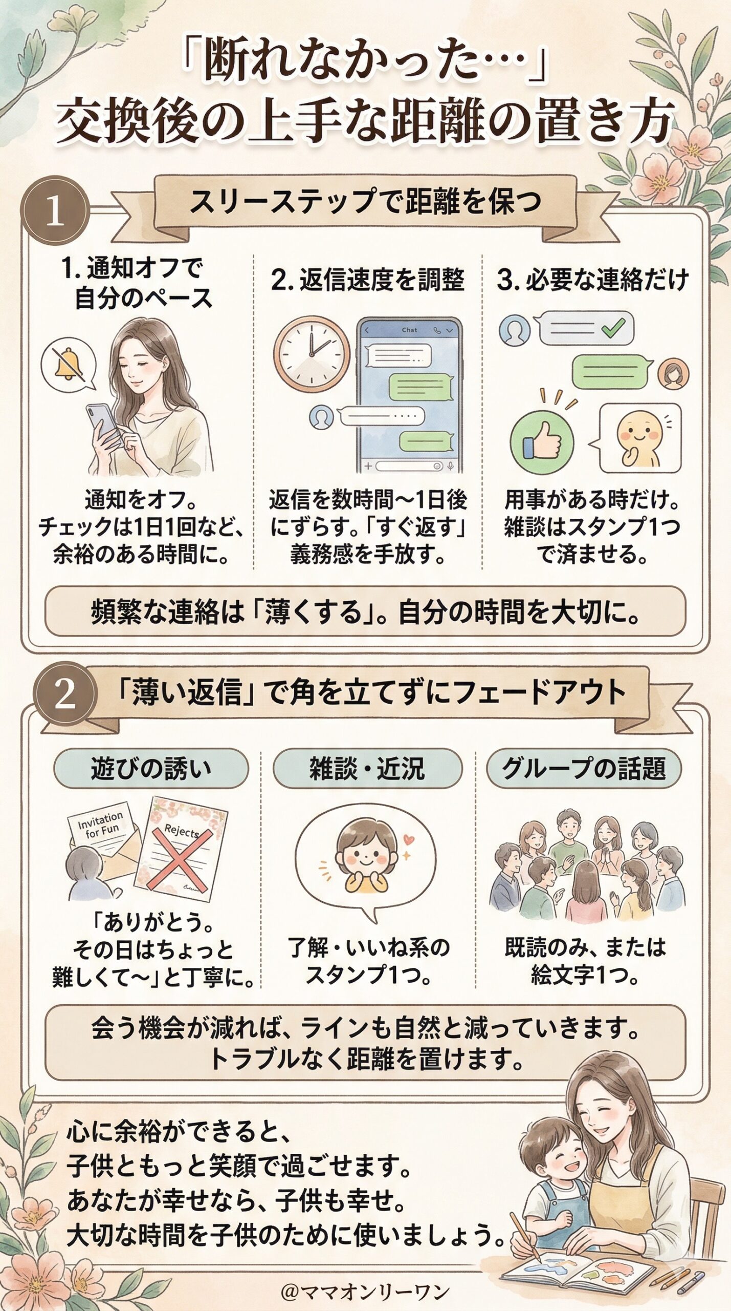 先輩ママたちの間では「誰とでも一定の距離を保つ」「返信できない宣言を最初からしておく」という考え方も広まっています。ライン交換をするかしないかより、自分の心地よさを基準にすること、それが一番大切です。