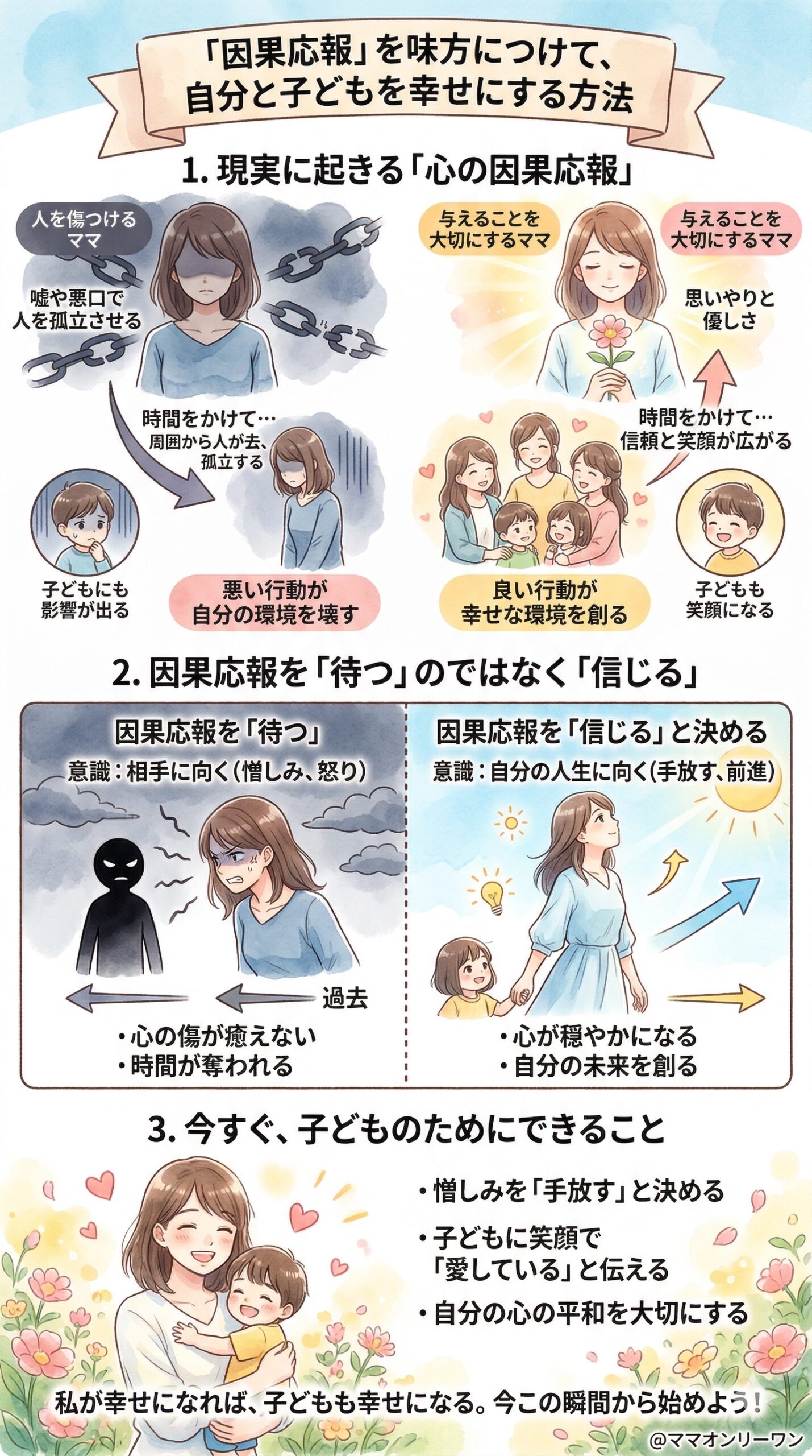 このページでは、実際に起きた事例をもとに、ママ友いじめの実態と「因果応報は本当に起きるのか」という問いに正面から向き合っています。さらに、傷ついた心を守るために今日からできる、具体的な考え方や行動についてもお伝えします。