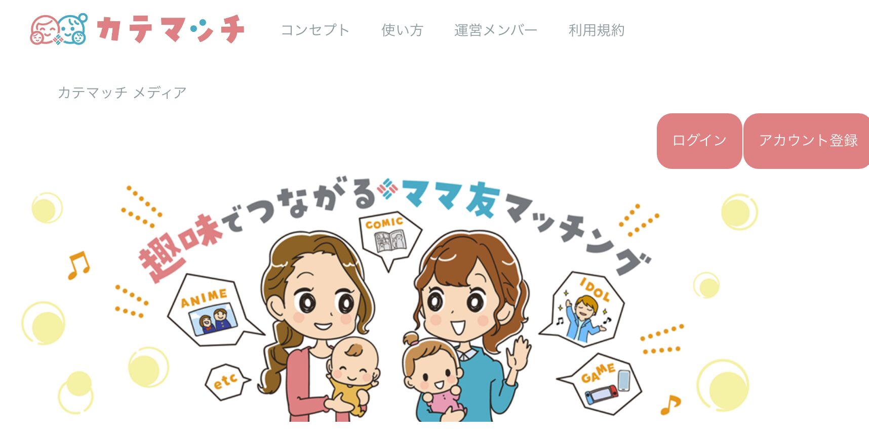 「子育ての話だけじゃなくて、自分自身の話もしたい」というママには、かてマッチが合うかもしれません。趣味や好きなことをベースにマッチングする仕組みで、ママである前に一個人として話せる友人が欲しいという気持ちに応えるアプリです。
