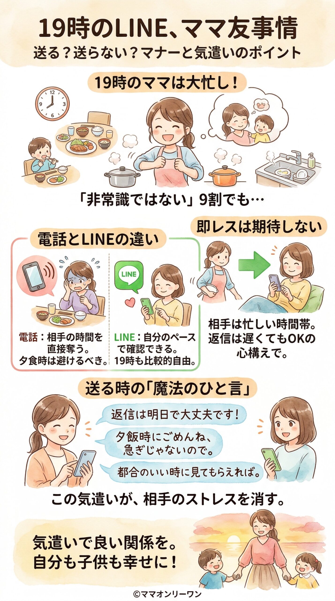 「返信はいつでも大丈夫」のひと言があるだけで、受け取った相手の気持ちはまったく変わります。時間帯の知識だけでなく、そのちょっとした配慮を知っているかどうかが、ママ友関係のストレスを左右します。