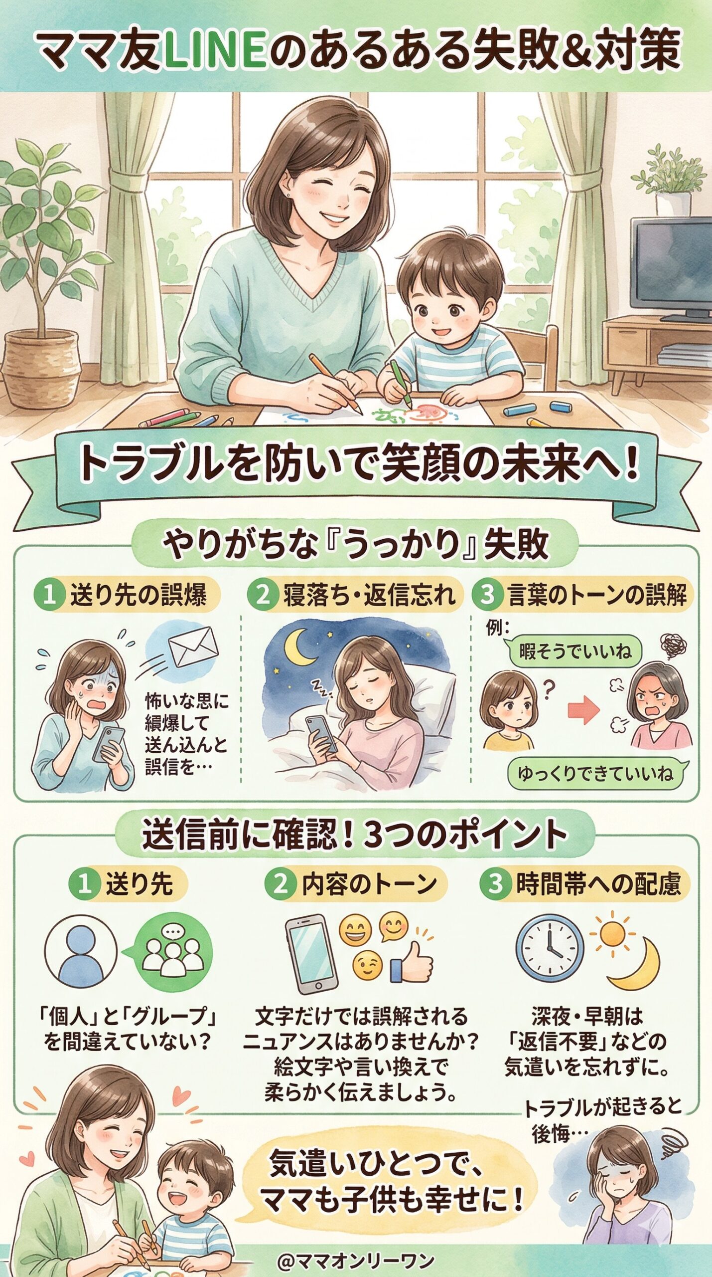 これだけ失敗談が出てくるということは、対策を知っているかどうかで大きく変わるということです。実際にLINEトラブルを経験したママたちが「こうすればよかった」と語る内容をまとめると、3つのポイントに集約されます。
