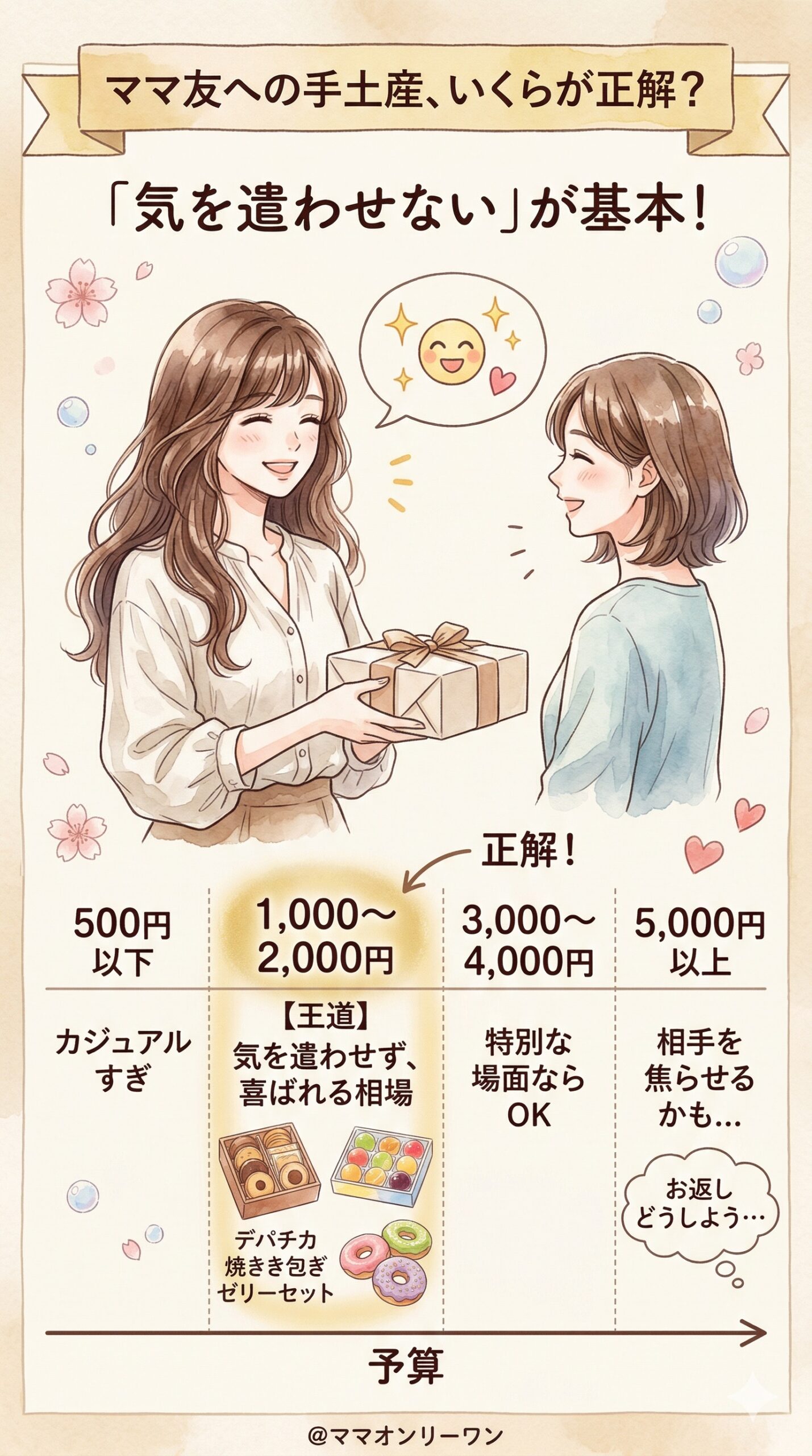 ママ友への手土産は、1,000〜2,000円前後が相場です。この価格帯だと、受け取る側も「お返ししなきゃ」とならずに、素直に喜んでもらえます。