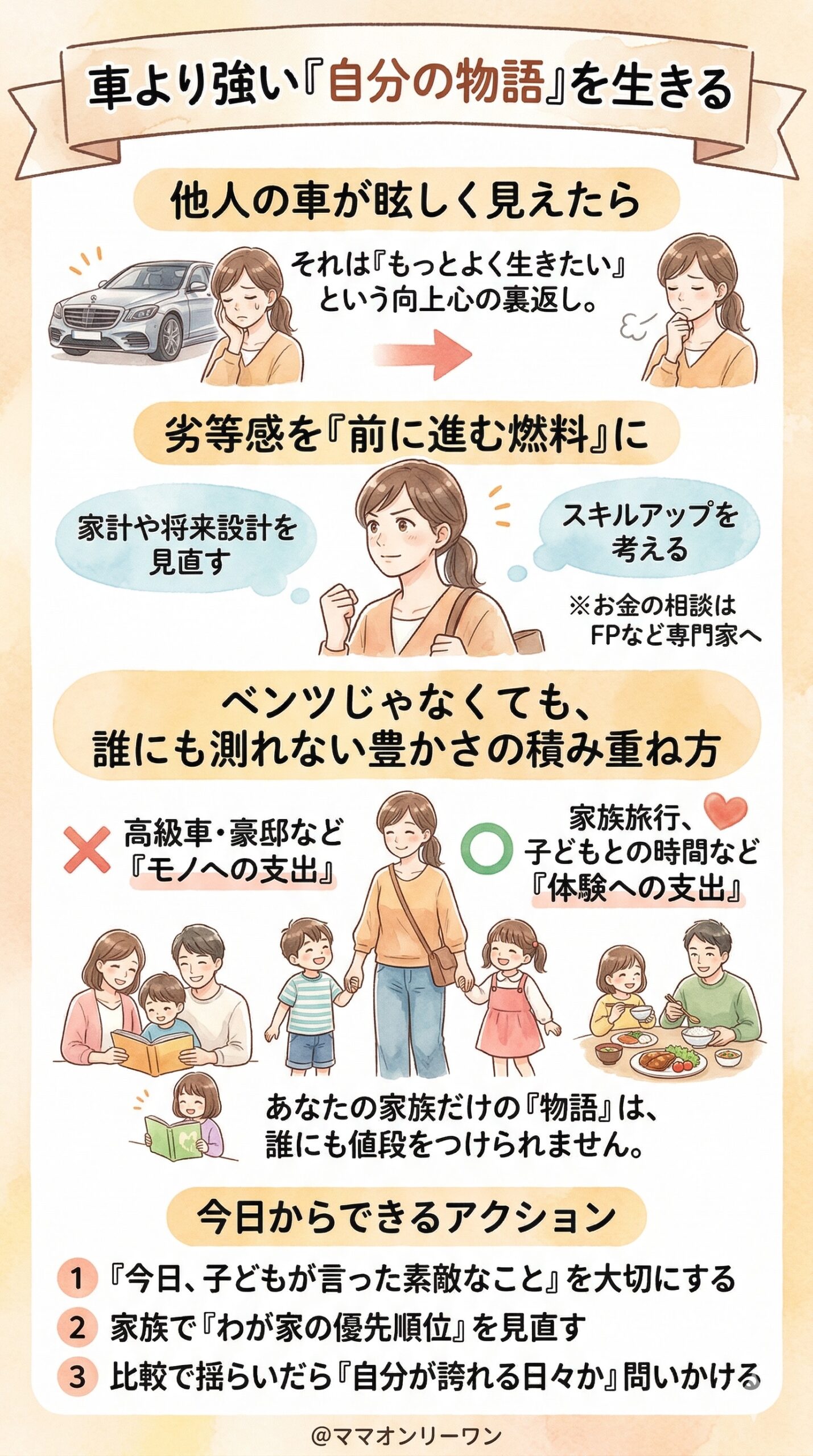 今、軽自動車で子どもを送り迎えしていても、節約しながら家族の時間を大切にしていても、それはあなた家族だけの物語になっています。その物語は、誰にも真似できないし、誰にも値段をつけられません。