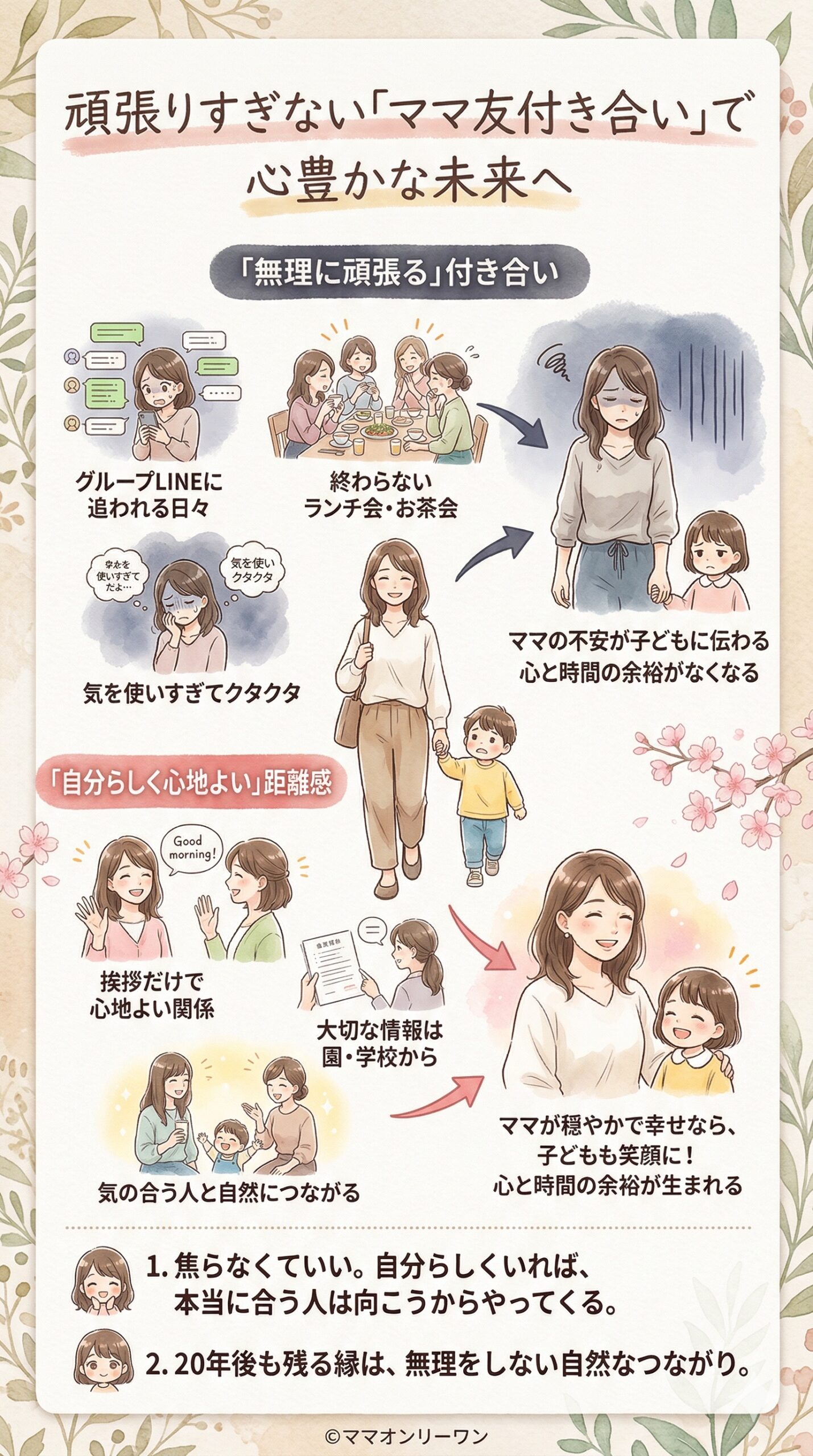 大切なのは、こういったすれ違いが起きやすいのがママ友関係の特性だということ。誰かが悪人なわけじゃなく、「ちがう生活リズムの人たちが、子ども経由でつながっている」という構造的なしんどさが根っこにあります。