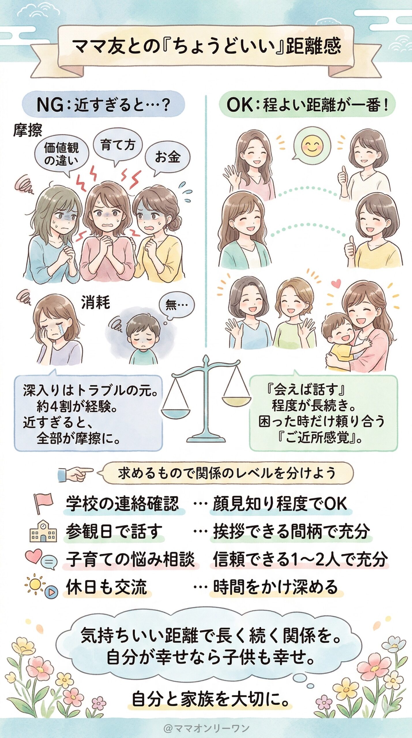 仲良くなったらなったで、今度は「近すぎてしんどい」という問題が出てくることもあります。どのくらいの距離感がちょうどいいのか、それぞれのママの体験から見えてきたことをまとめます。