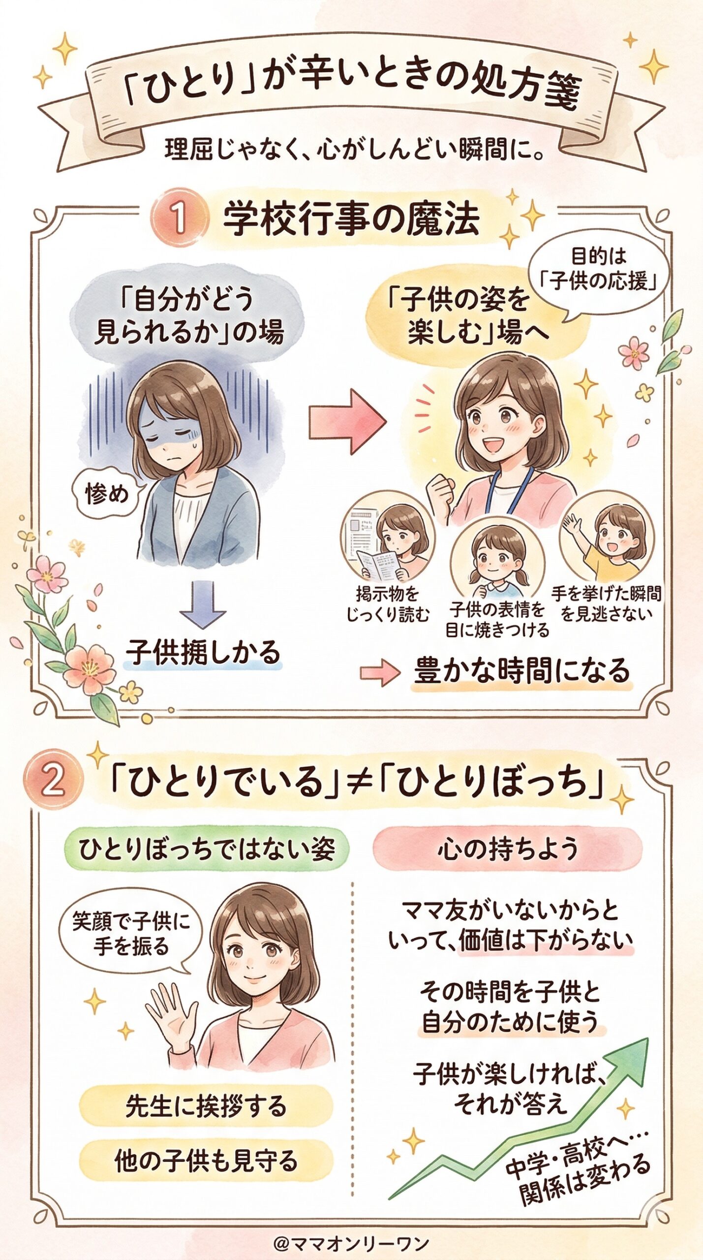 参観日に話す相手がいなくても、子供には笑顔で手を振れる。先生に挨拶できる。他の子供たちの様子を温かく見守れる。その全部が「ひとりぼっち」とは正反対の姿です。