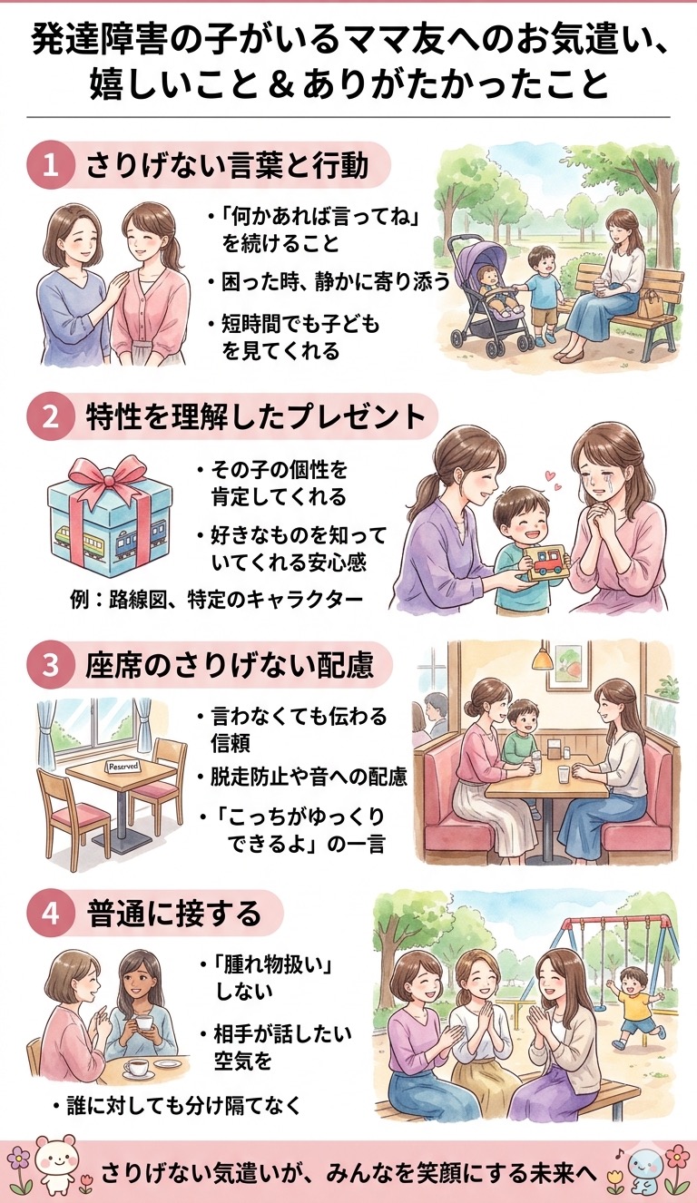 障害のある子を育てるママが「この人と一緒にいると楽だな」と感じる瞬間は、大げさな気遣いではなく、さりげない配慮から生まれます。
