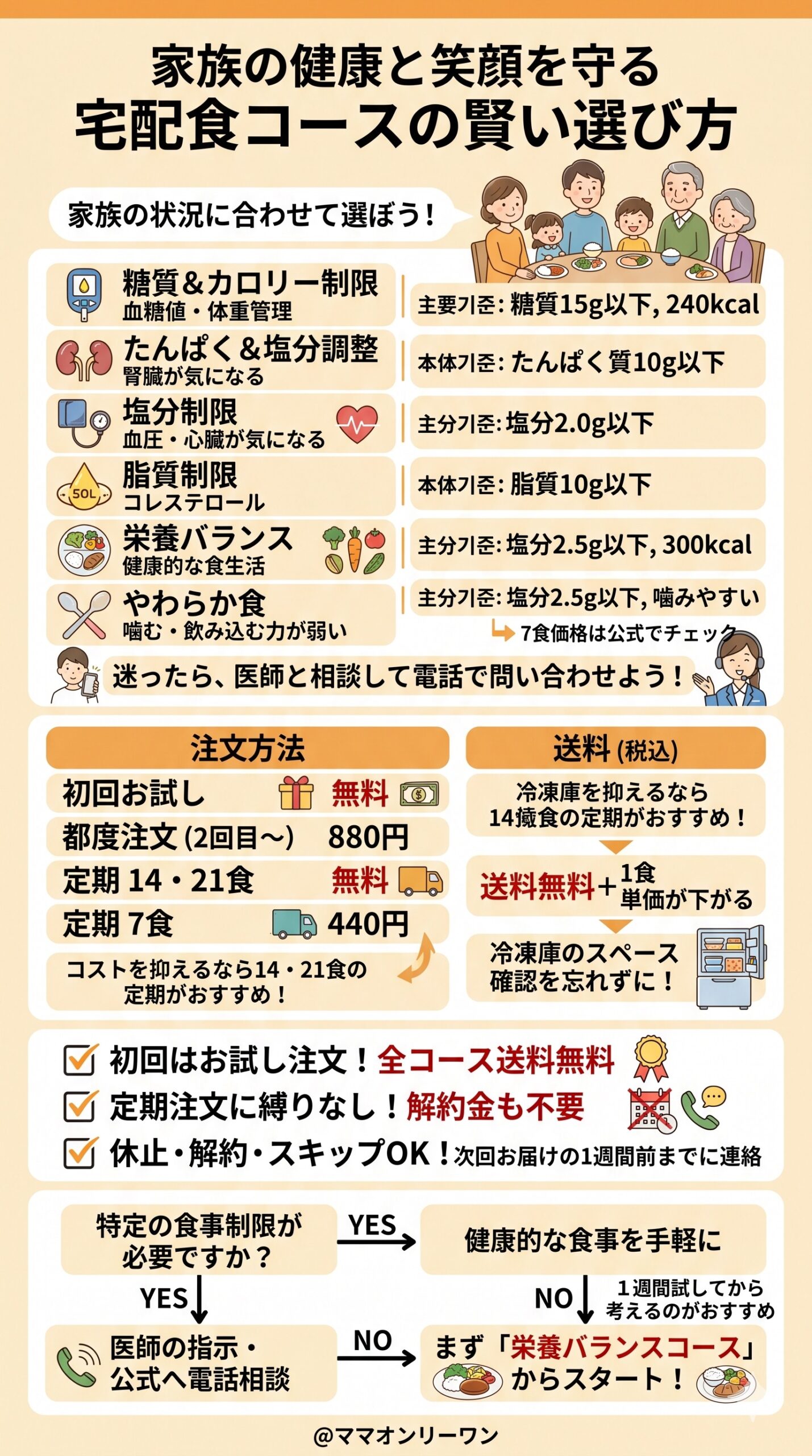 家族の状況に合わせてコースを選ぶのが基本です。迷ったら購入前に電話で相談するのが一番確実で早いです。