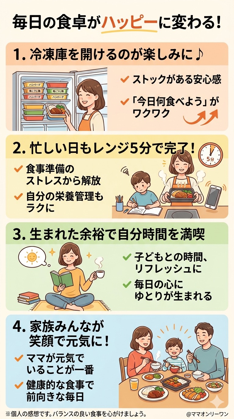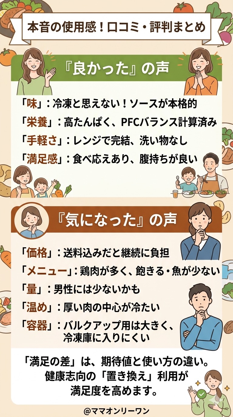 自炊で同じことをやろうとすると、食材を選んで、計算して、調理して、という工程が発生します。それを毎食やり続けるのは、家族の食事も作りながらでは正直しんどいです。その「しんどさ」をそのまま引き受けてくれるのが、このサービスの本質的な価値だと思っています。