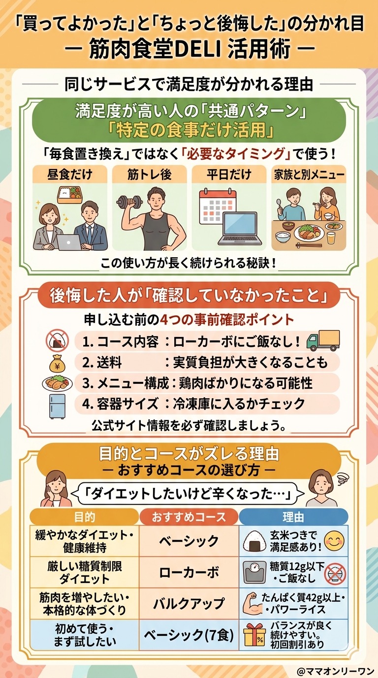 筋肉食堂DELIを試して「合った」と感じた人の共通点は、「使い方を決めていた」ことです。毎食置き換えではなく、昼だけ・忙しい日だけ・筋トレ後だけ、といった使い方をしている人ほど満足度が高い傾向があります。