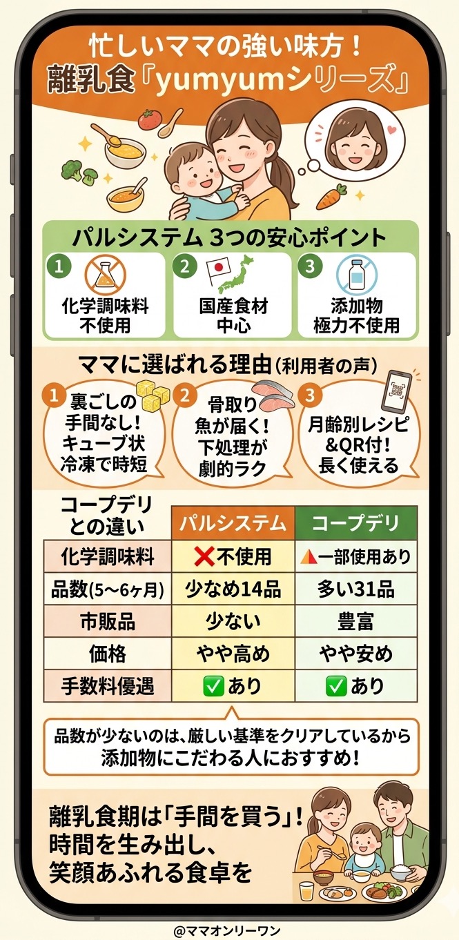 離乳食期のパルシステムは「手間を買う」という使い方が最も合っています。手間が減ること自体に大きな価値がある時期なので、費用よりも時間の節約を優先できる方にはまじでおすすめです。