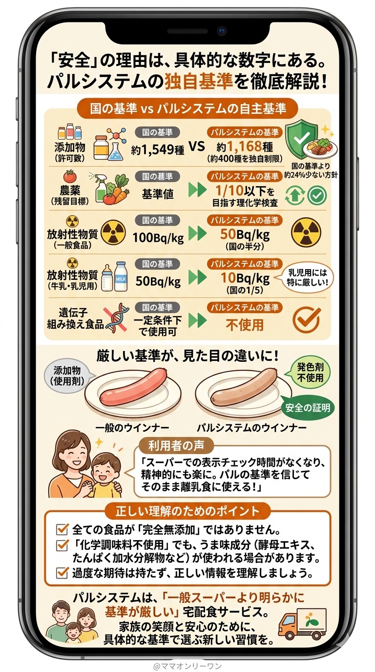数字を見ると、基準の差がはっきりします。「パルシステムだから安全」ではなく、「パルシステムの基準で作られた食品は国の基準より厳しい条件をクリアしている」という理解が正確です。