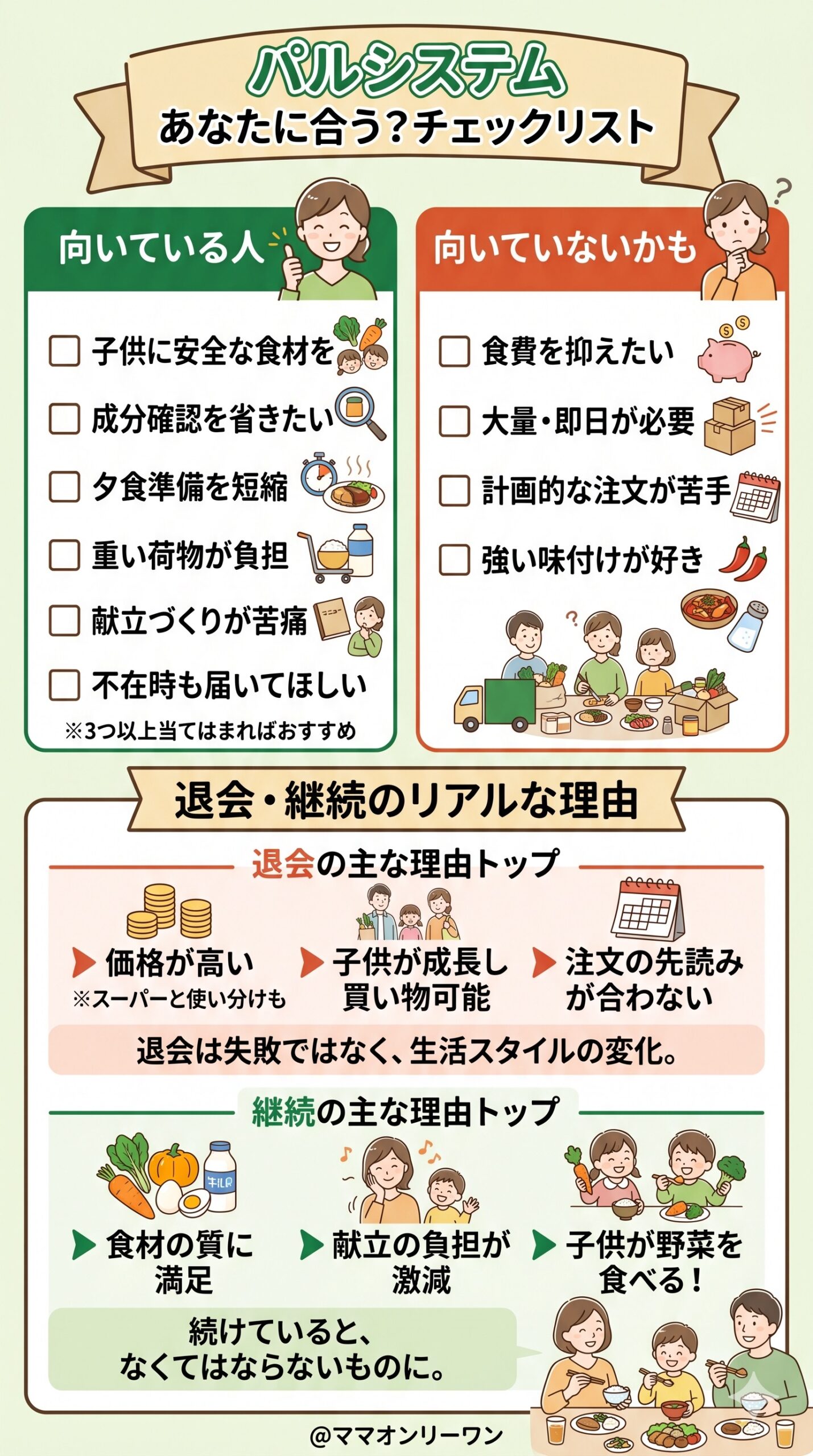 パルシステムが合う人は、子供の食事に安全性を求めていて、買い物の手間を減らしたくて、食材の質を価格より優先できる人です。この3つが揃っていれば、使い始めた後に後悔する可能性はかなり低いでしょう。
