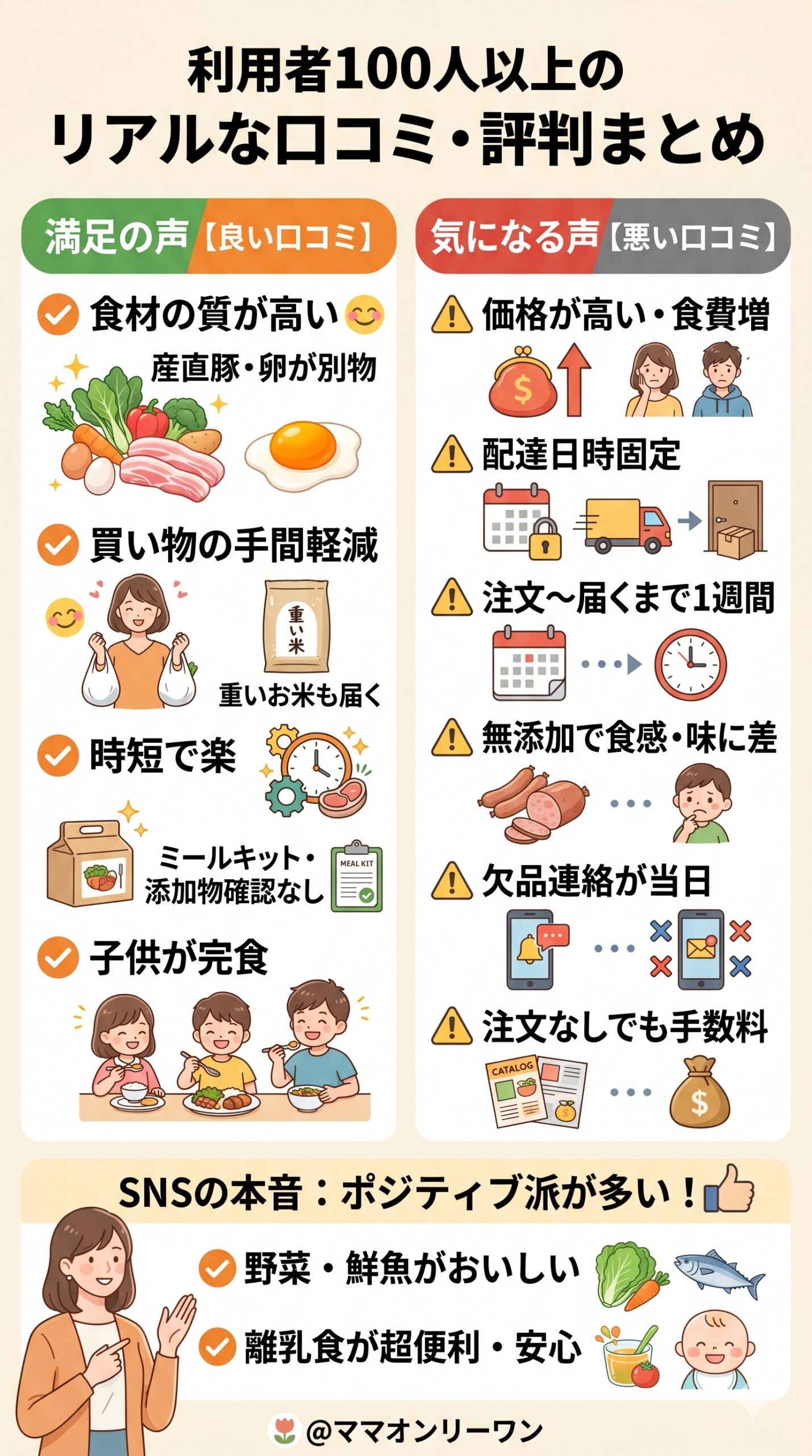 SNSの声は良いものも悪いものも本音が出やすいです。数百件の投稿を見渡した感触では、ポジティブな投稿のほうが明らかに多いです。特に食材の味と離乳食への評価は高い傾向があります。