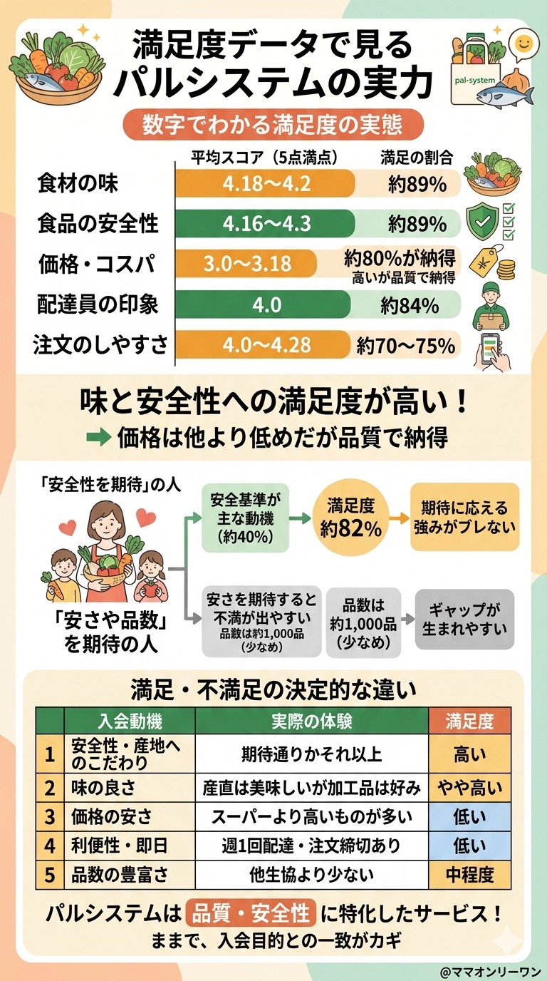 実際に100人以上に聞いたアンケートでも、75%が総合満足と答えており、特に安全性・味への満足度は89%という数字が出ています。満足していない25%の多くは「価格が高い」か「配達の仕組みが合わなかった」に集約されます。