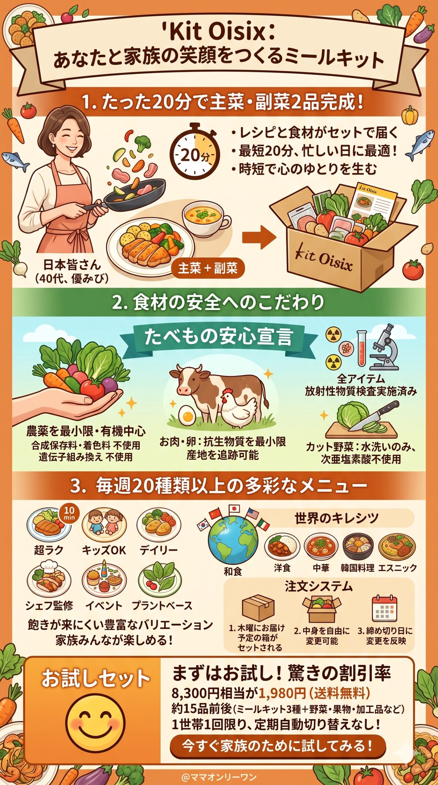 スーパーでは産地すら確認できないことも多い中、ここまでのこだわりを持つミールキットは多くありません。食に敏感なご家庭には、大きな安心材料になるはずです。