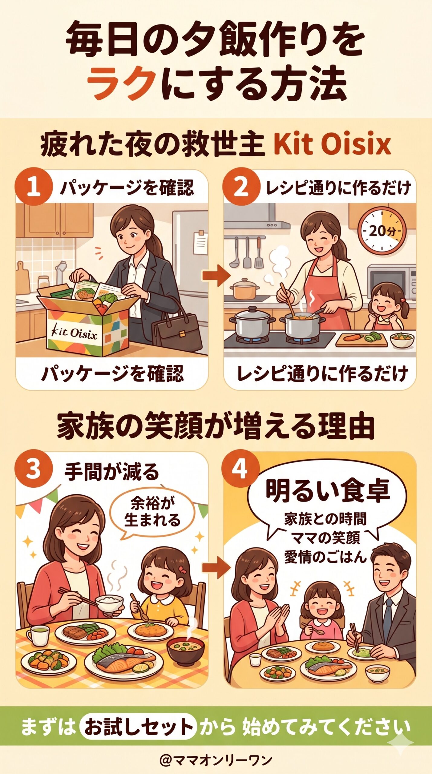 毎日の夕飯作りの負担が減ると、ママの笑顔が増えます。その笑顔は確実に家族に伝わります。