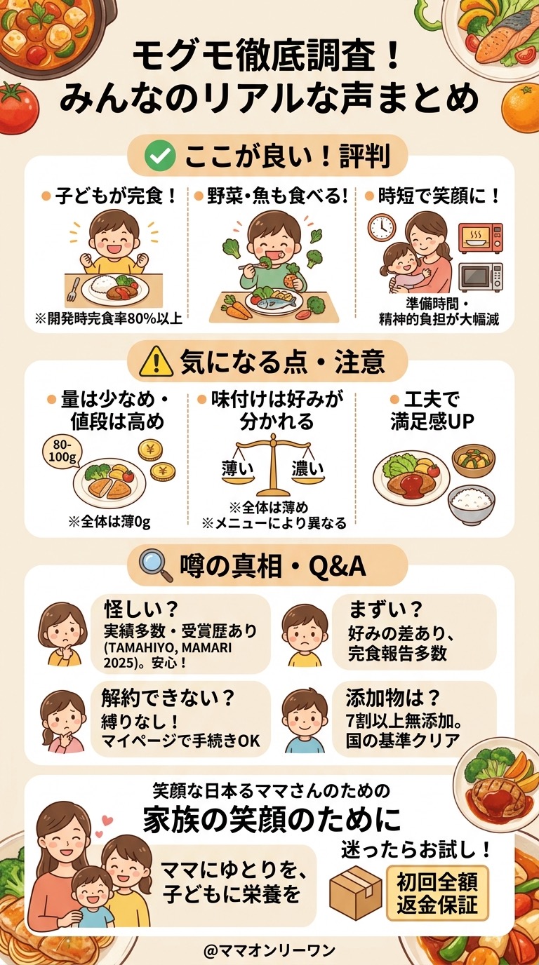 検索すると「モグモ 怪しい」「モグモ まずい」というキーワードが出てきます。これを見て不安になった方も多いはずです。実態を整理します。