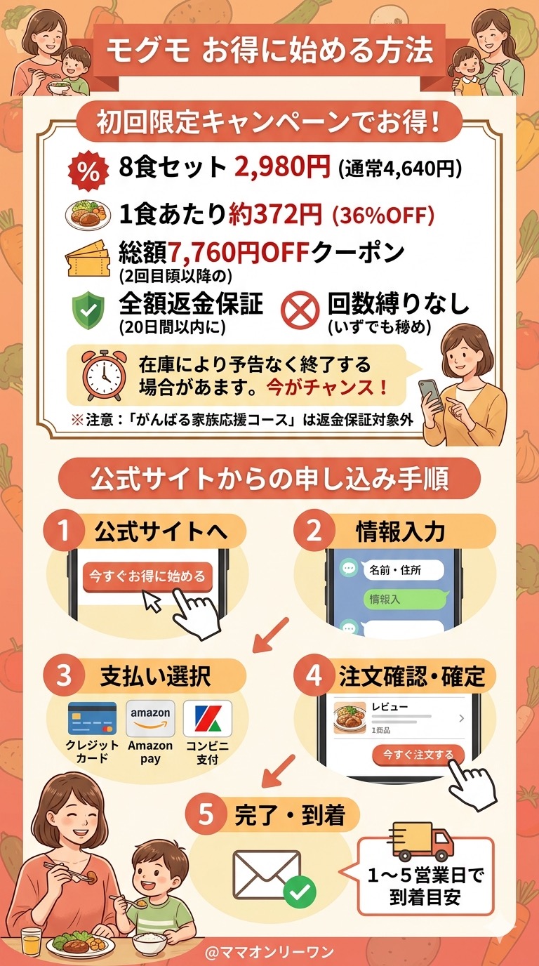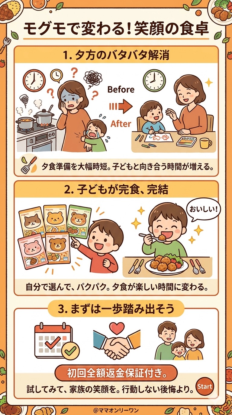「レンジで温めるだけの幼児食って、本当に子どもが食べてくれるの?」「栄養は大丈夫なの?添加物は?値段は続けられる?」——モグモ(mogumo)を検討しているなら、そういう疑問が頭の中をぐるぐるしているはずです。