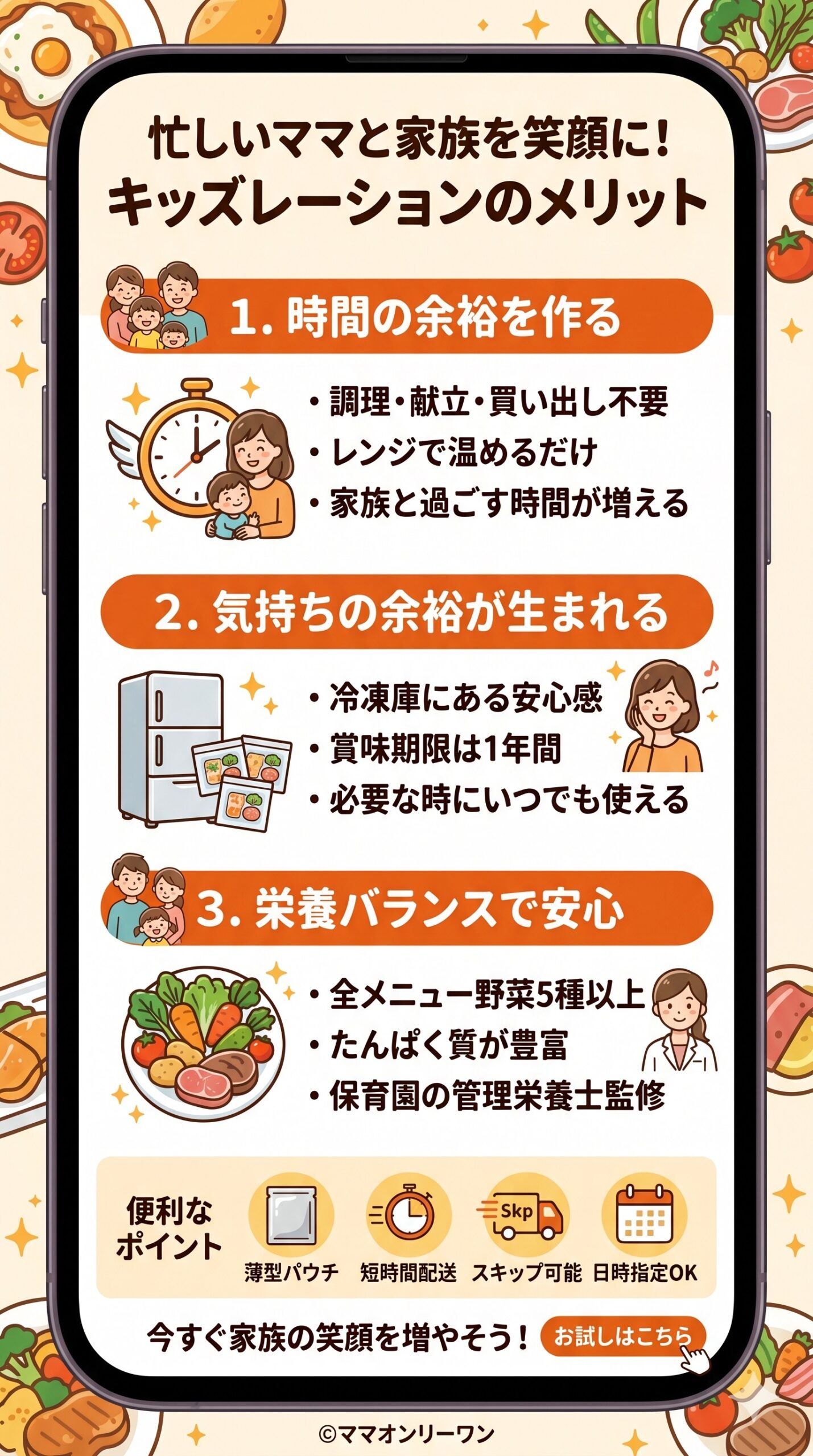 子どもの食事を毎日作り続けることは、それだけで本当にすごいことだと思います。キッズレーション(Kidslation)を使うことは手抜きでも逃げでもなく、限りある時間とエネルギーを大切な場所に使うための賢い選択です。