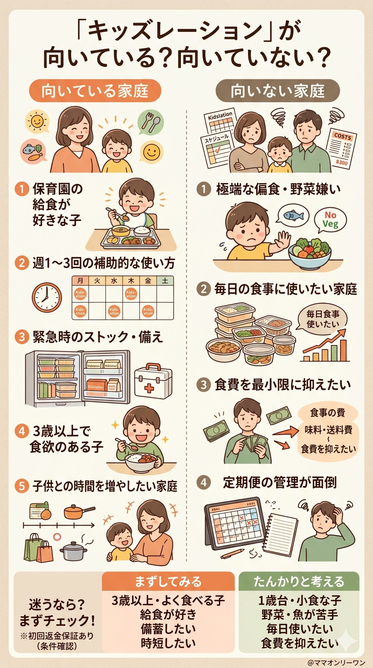 このページでは、キッズレーション(Kidslation)が自分の家庭に本当に合っているかどうかを見極めるための情報をまとめています。「向いている家庭」「向いていない家庭」の違いを、複数の体験談と栄養・味・使いやすさのデータをもとに、できるだけフラットにお伝えします。