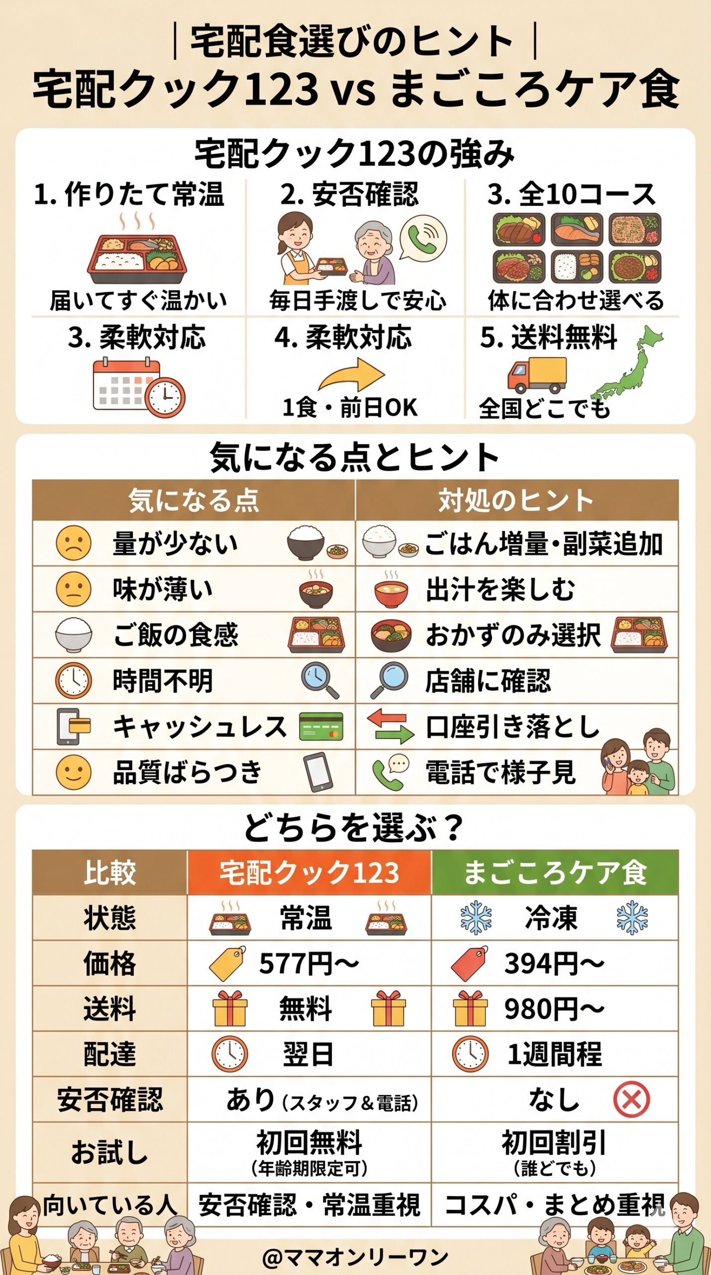 安否確認と作りたて配達を重視するなら宅配クック123、価格を抑えてまずお試ししたいなら「まごころケア食」という分け方ができます。どちらが優れているというより、家族の状況と何を重視するかで選ぶのが正解です。