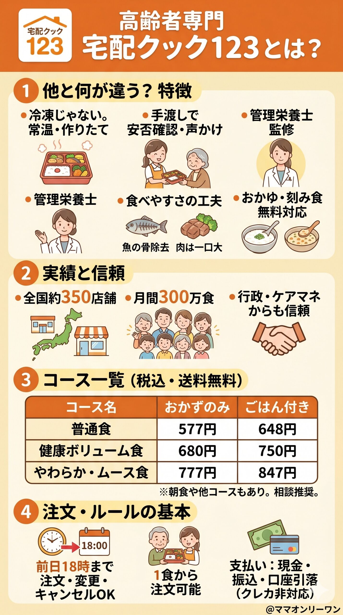 宅配クック123は、食事と安否確認を同時に届けてくれる高齢者専門サービスです。味だけを評価するサービスではなく、毎日顔を見せてくれる人が来てくれるという体験込みで設計されています。