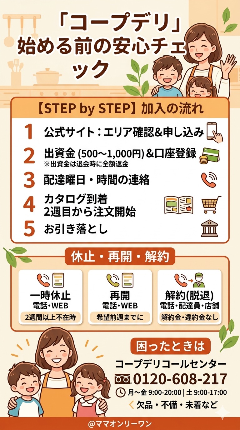 利用を始めるには、まず地域の生協に「組合員」として加入する必要があります。加入の際に出資金(500〜1,000円)が必要ですが、これは退会するときに全額返ってきます。入会金でも年会費でもないので、実質的な負担はほぼありません。