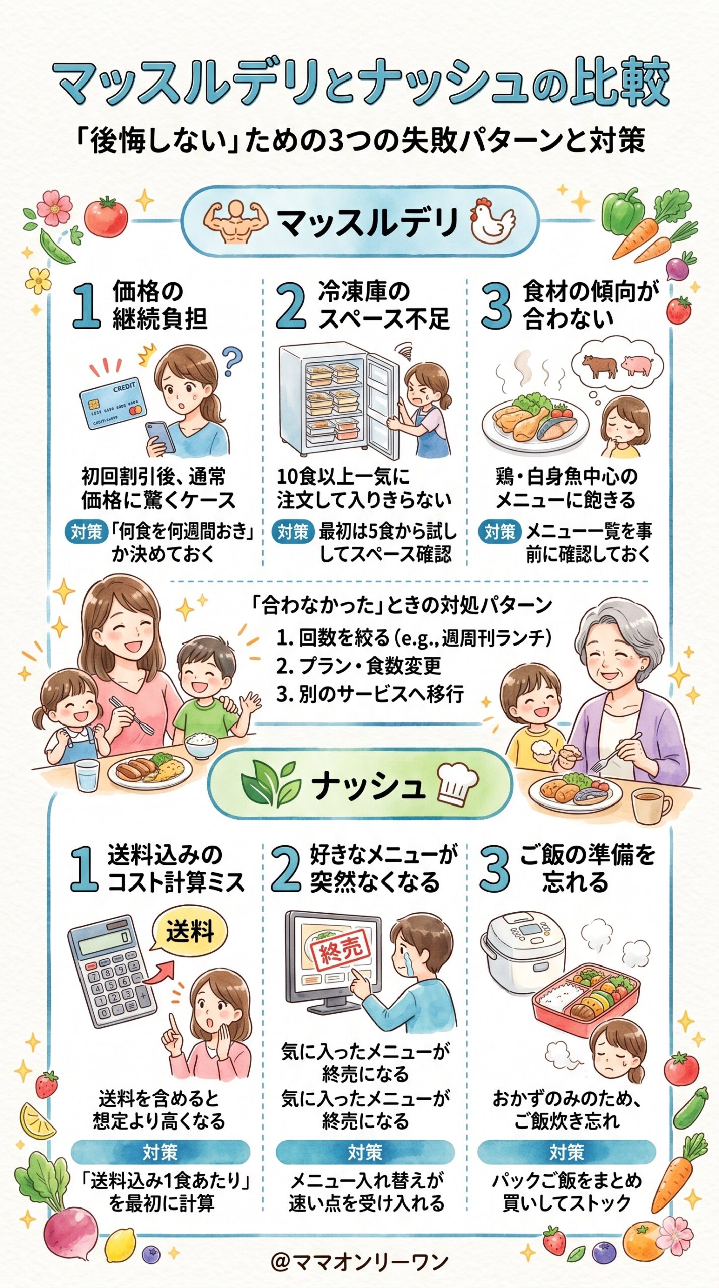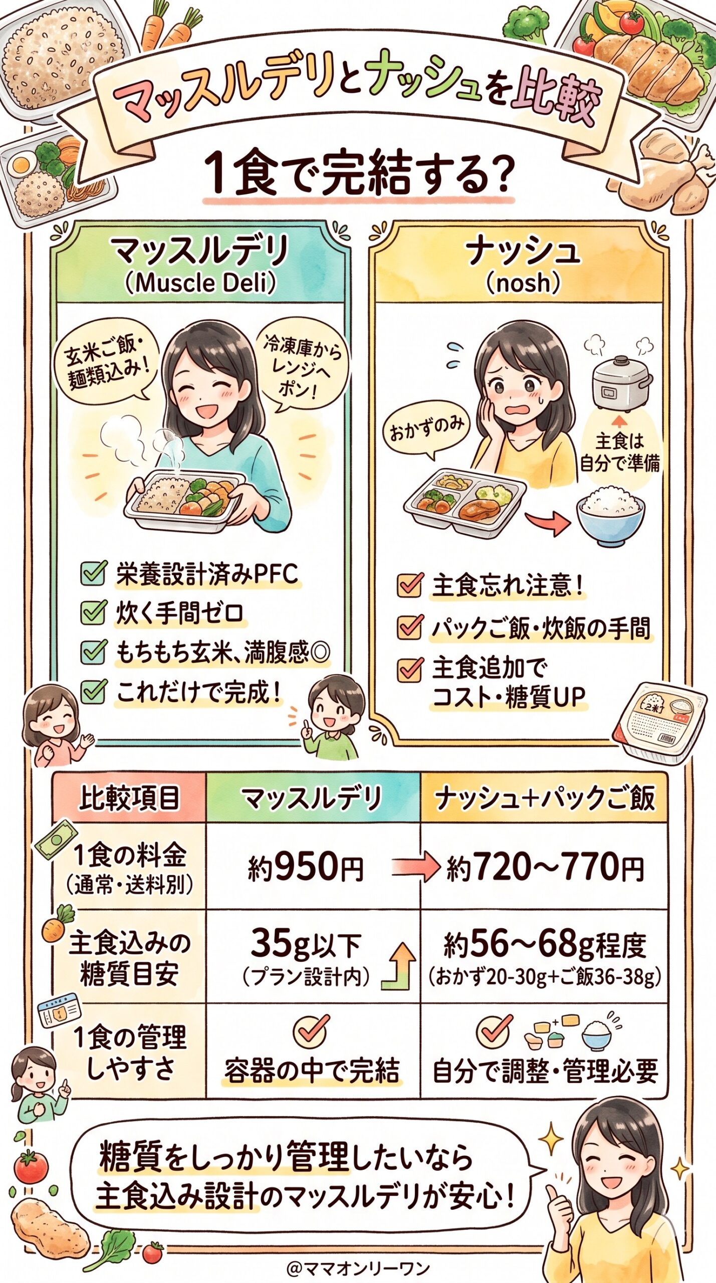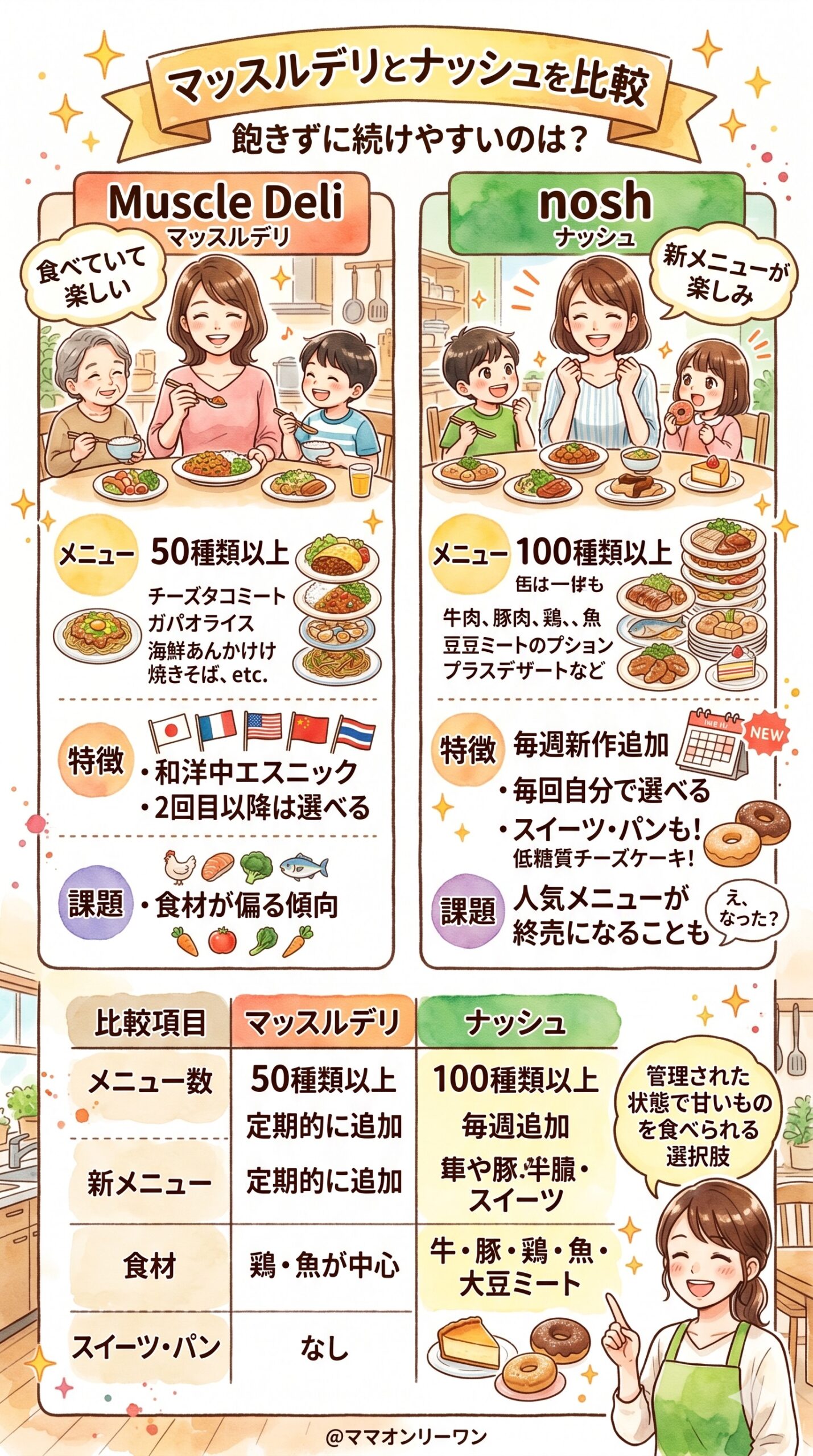 忙しいパターンがランチ中心ならマッスルデリ(1食完結)、夕食の手間を減らしたいならナッシュ(品数が多く食卓が豊かに見える)という使い分けが向いているかもしれません。