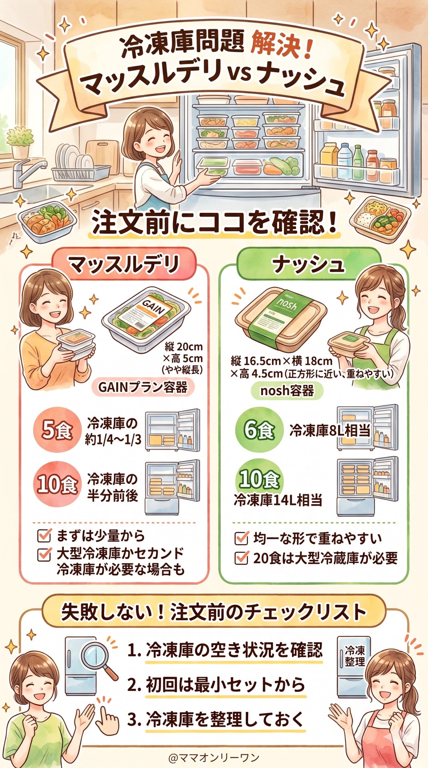 | 冷凍庫スペース | 5食分(縦20cm×横15cm×高さ4.5cm×5個)確保できる | 6食分(縦16.5cm×横18cm×高さ4.5cm×6個)確保できる |