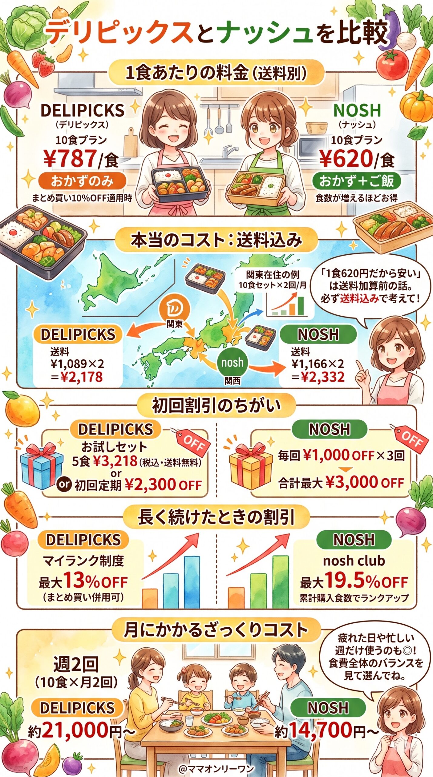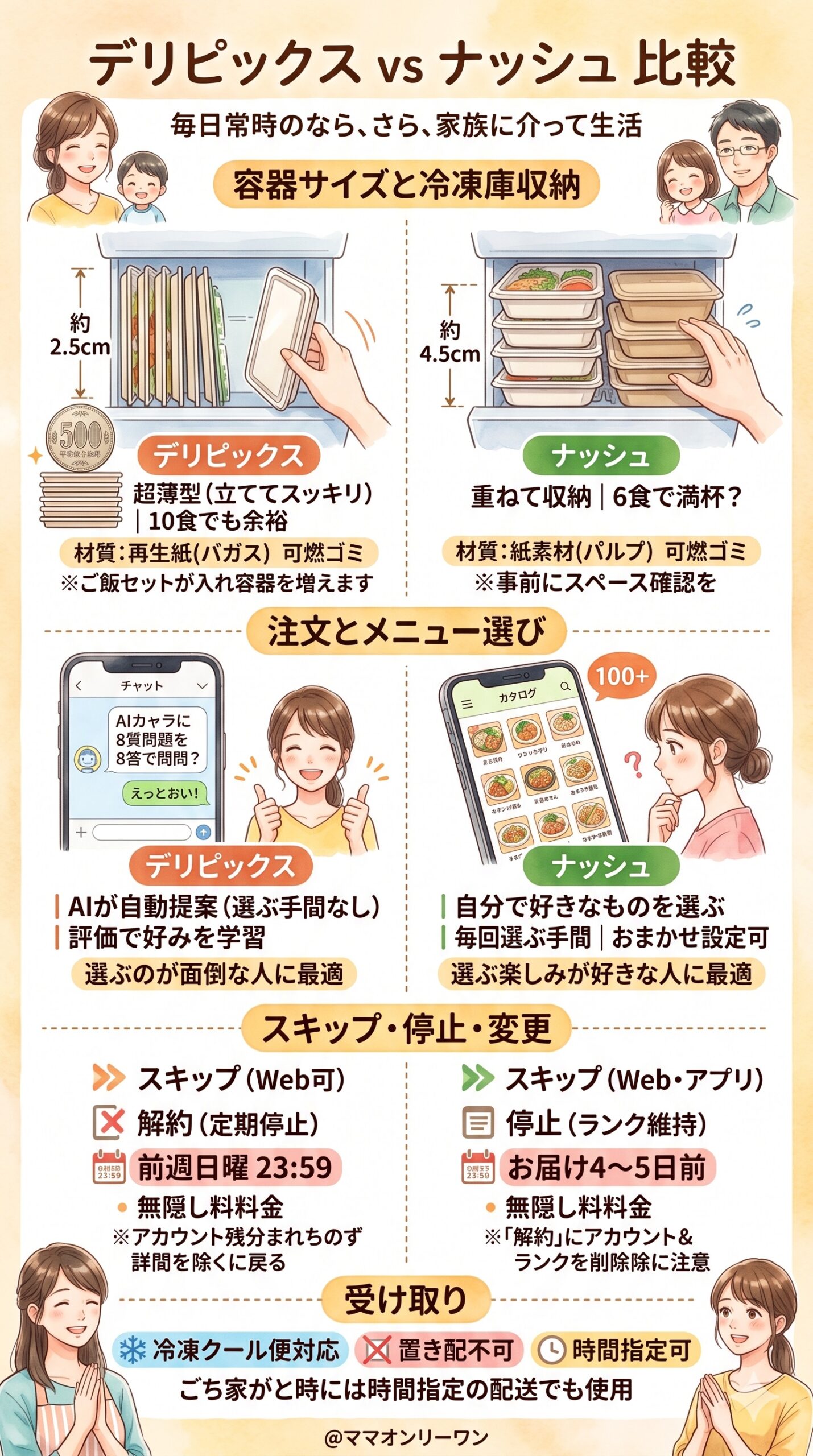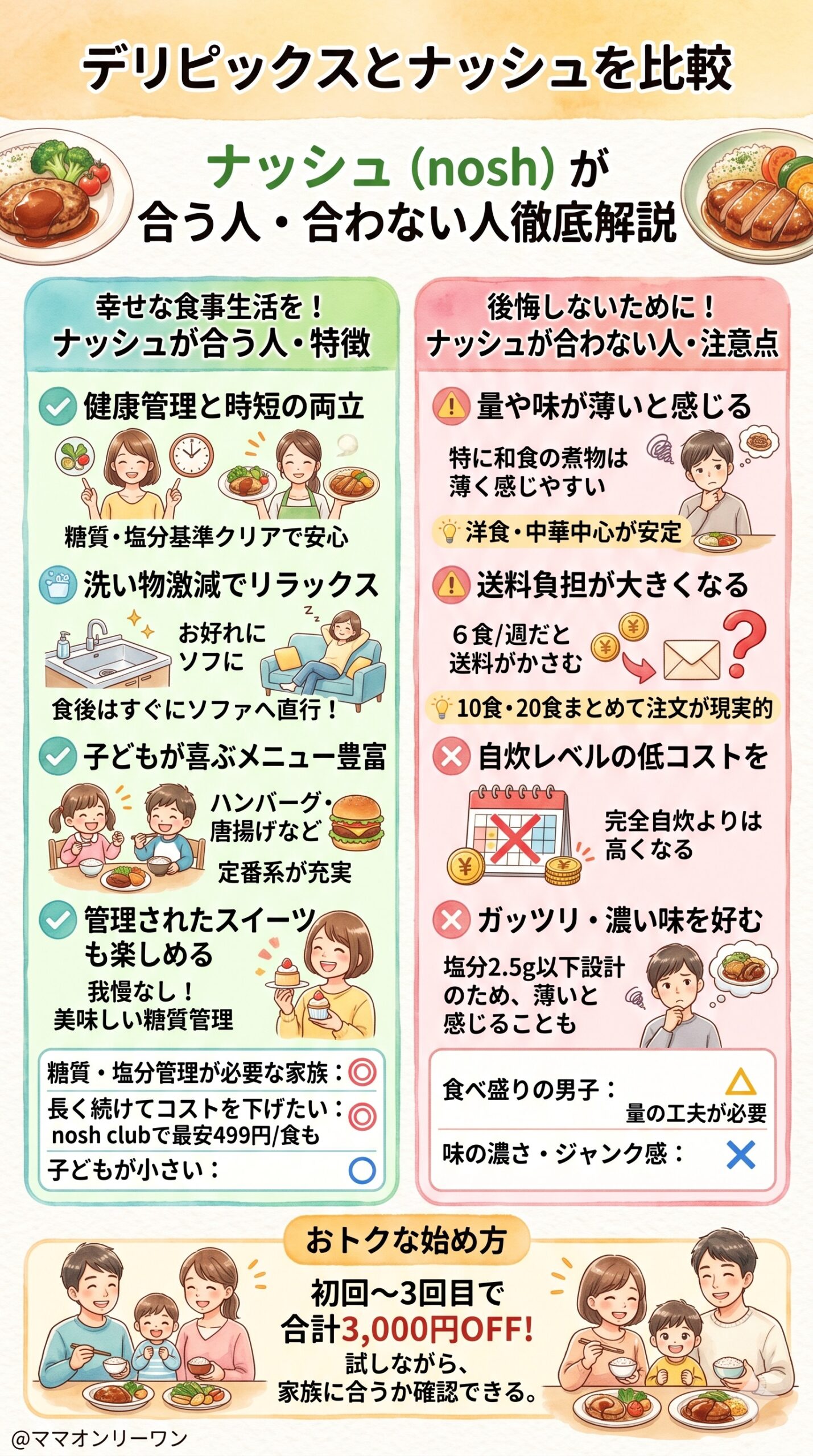 「毎日の食事がおいしくない、家族の食卓をもっと豊かにしたい、外食に近い満足感を自宅で得たい」——この感覚が強いならデリピックスが向いています。逆に「とにかく毎日の食事準備を楽にしたい、栄養管理を続けたい、長く使える仕組みを作りたい」という感覚が強いならナッシュが向いています。