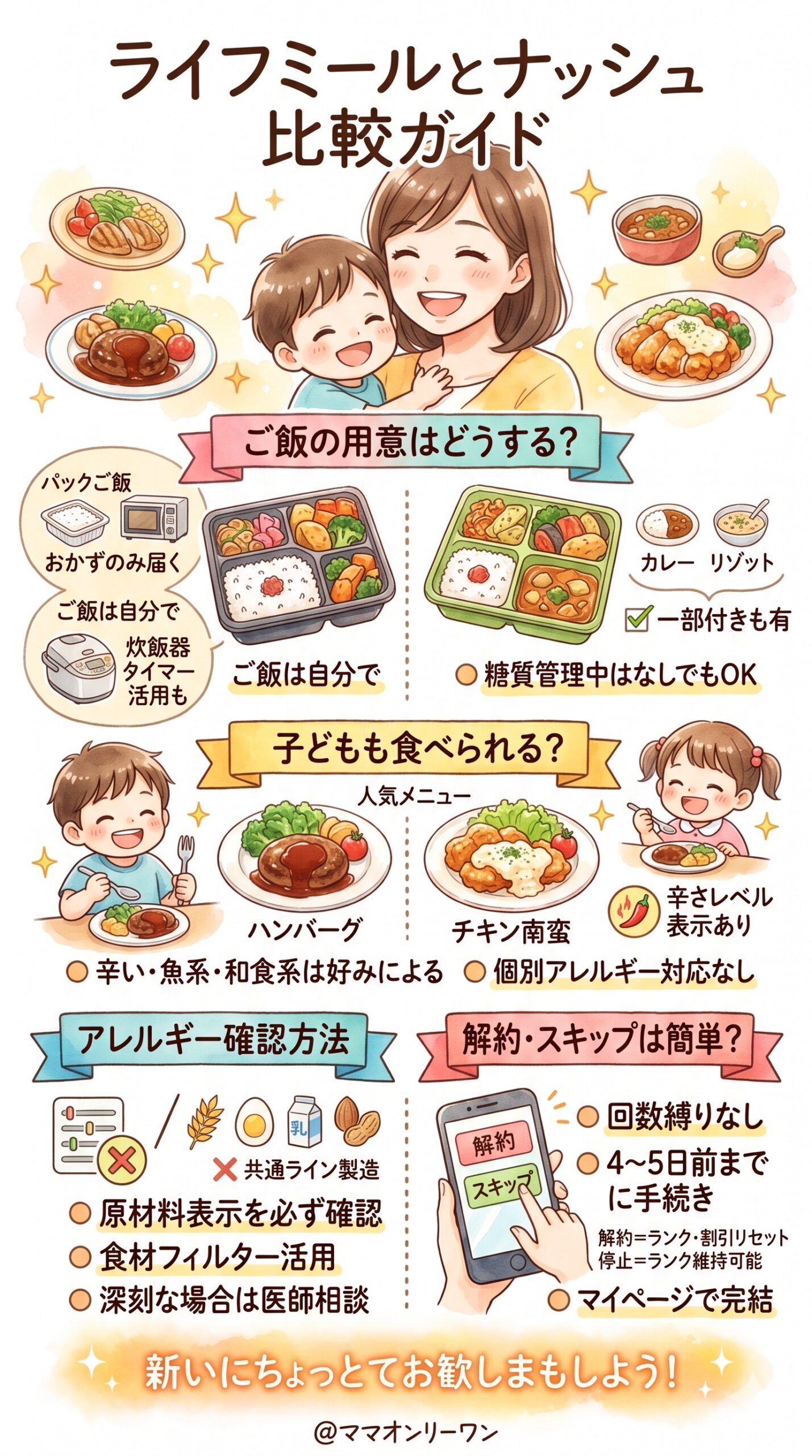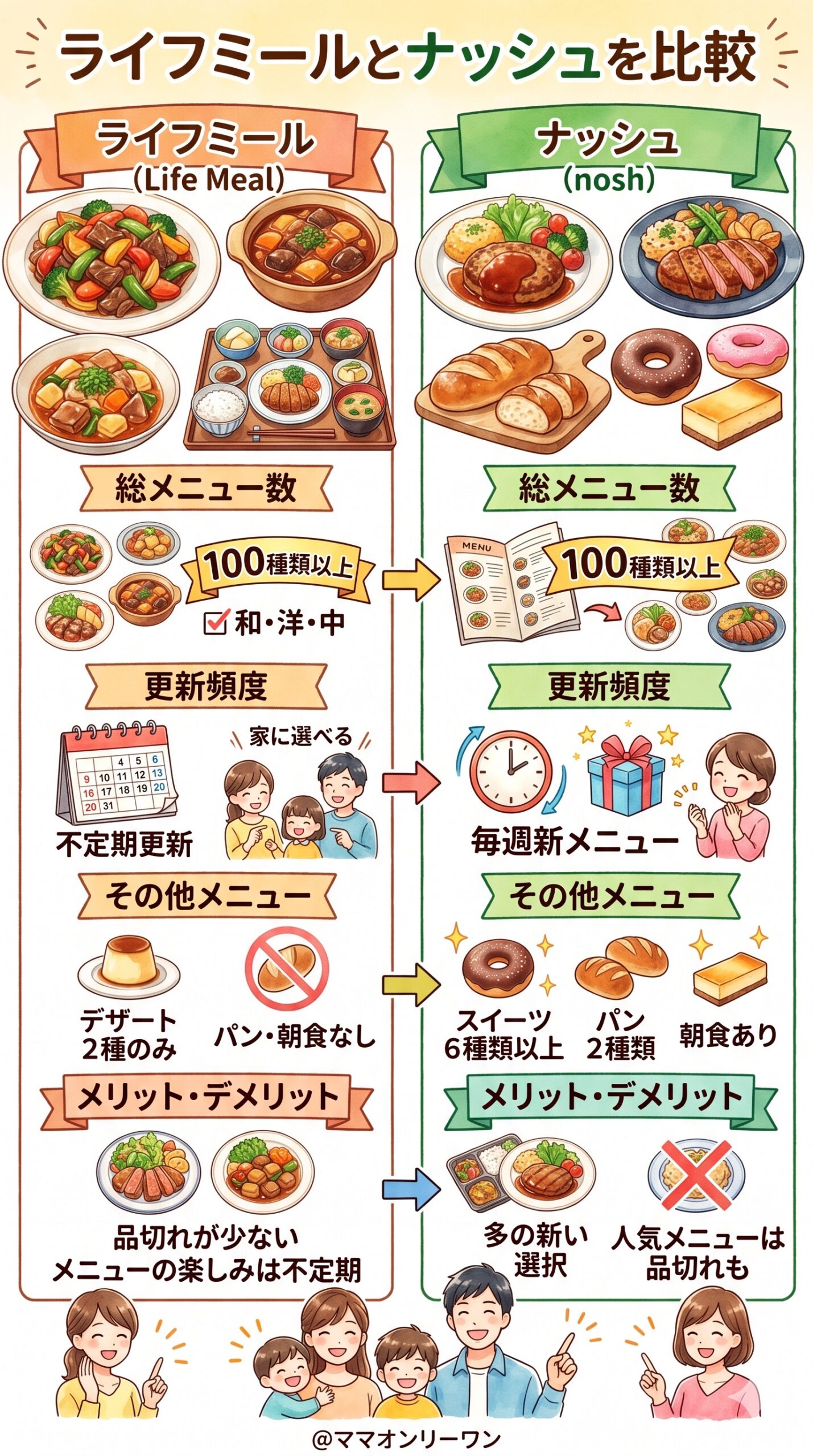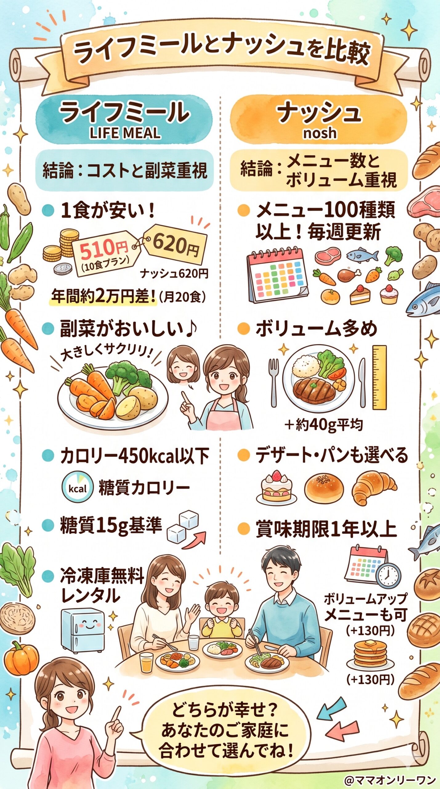 先に結論をお伝えすると、コスト重視ならライフミール、メニューの多さ重視ならナッシュが向いています。読み終えたあとには、自分の家族にどちらが合うか、迷いなく判断できるようになっているはずです。
