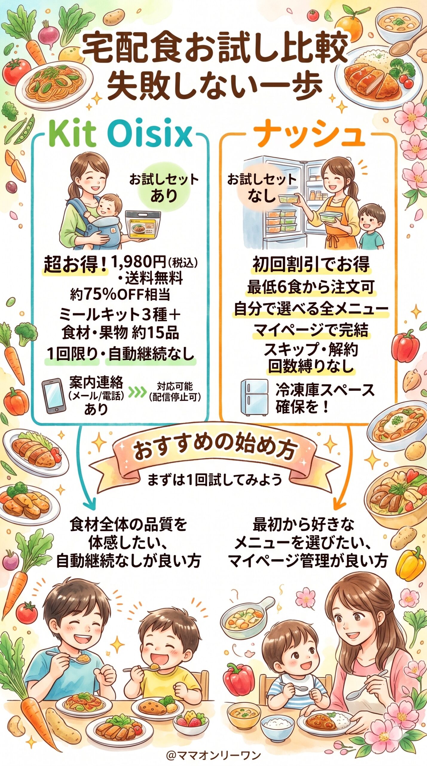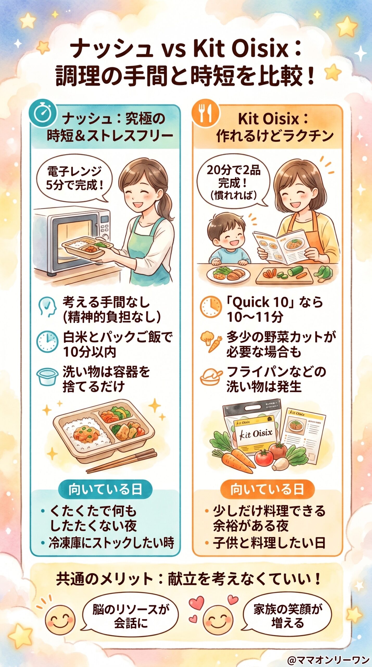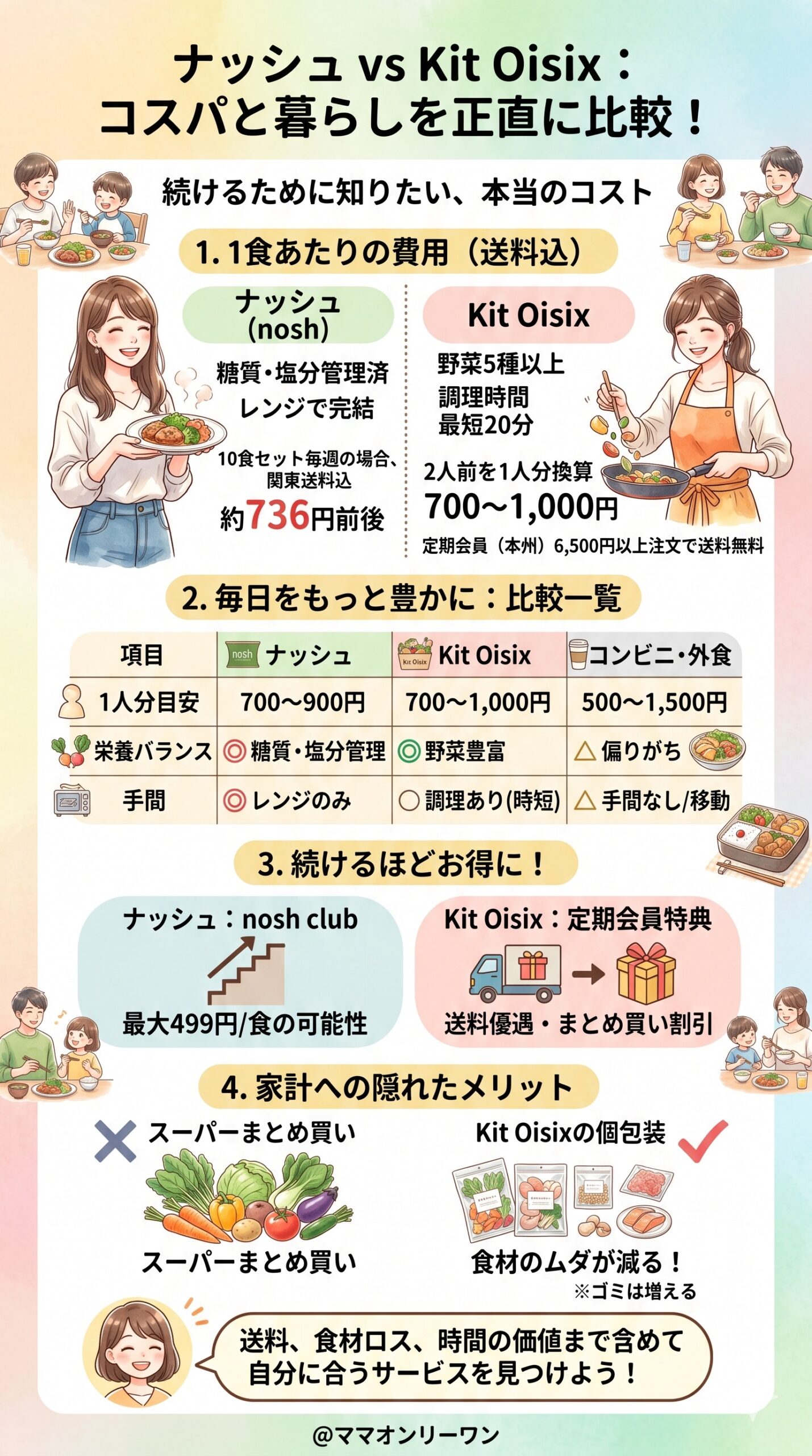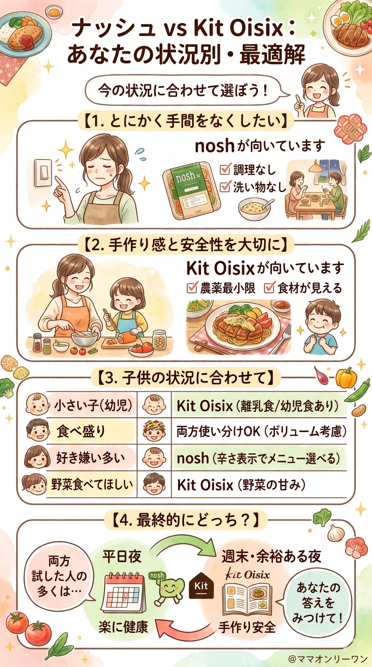 どちらか一方に絞るとしたら、「子供が小さい・食材の安全性最優先」ならKit Oisix、「とにかく楽にしたい・健康管理もしたい」ならナッシュ、というのが多くの方の選択のようです。
