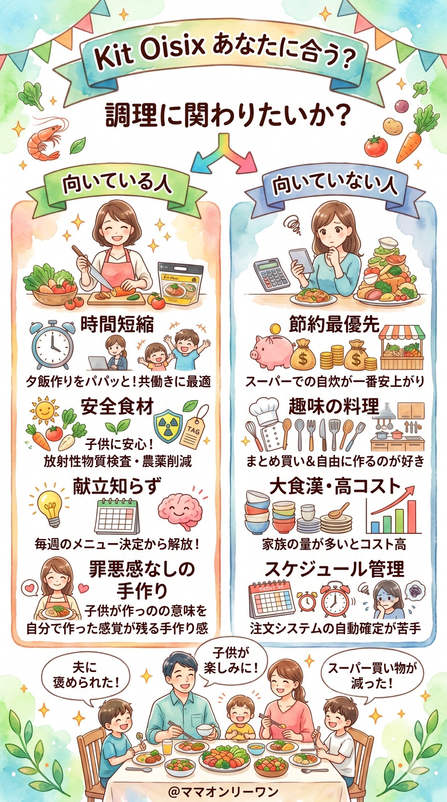 Kit Oisixが解決したいのは「献立の悩みと買い物の手間」です。調理は自分でするけれど、何を作るか・何を買うかを決める負担を減らしたい人に向いています。