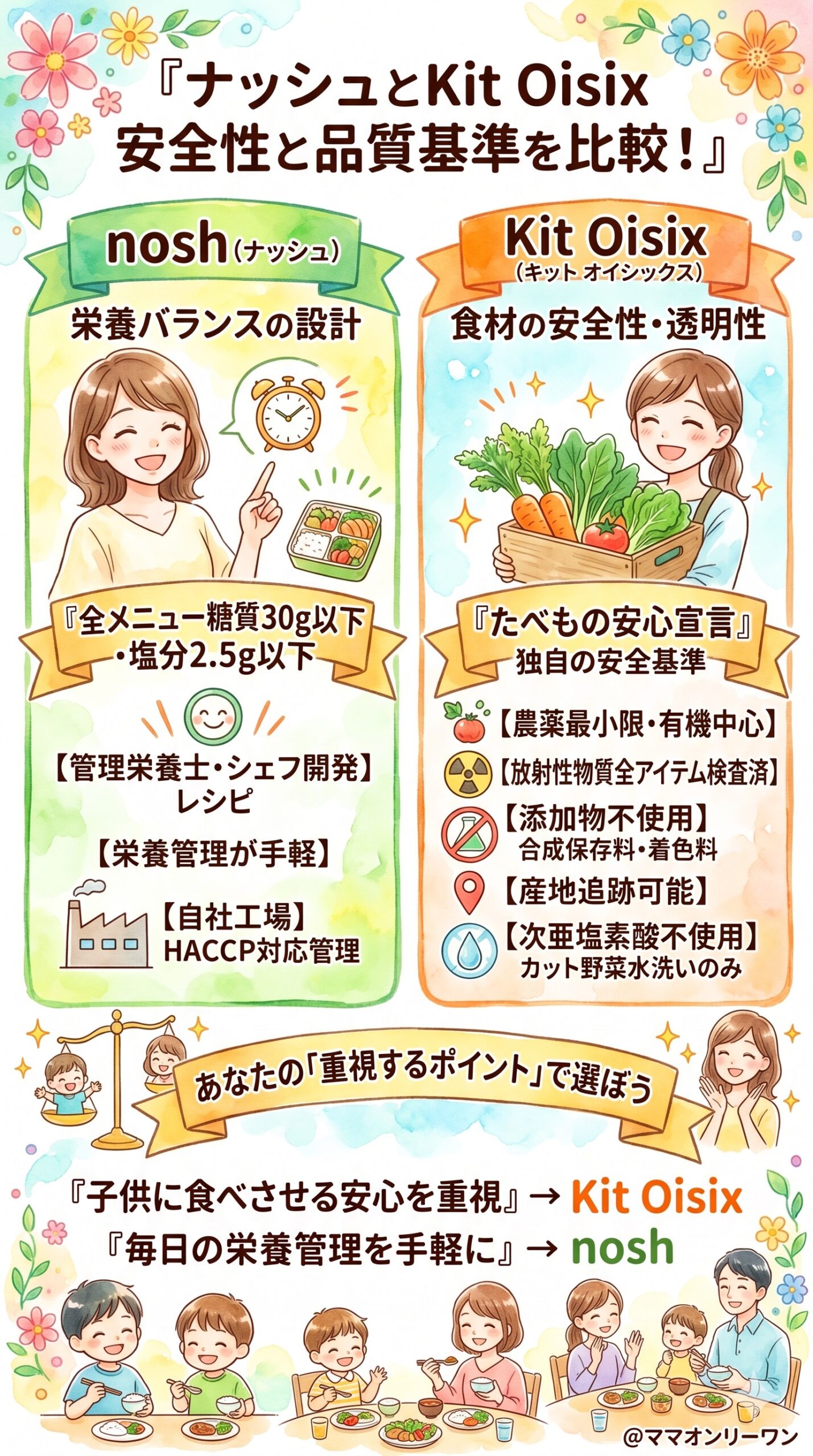 食材の原材料や産地にこだわりたいならKit Oisix、毎日の栄養バランスを手軽に整えたいならナッシュという判断軸が参考になります。どちらが「より安全」かは一概には言えませんが、重視するポイントでサービスを選ぶことが大切です。