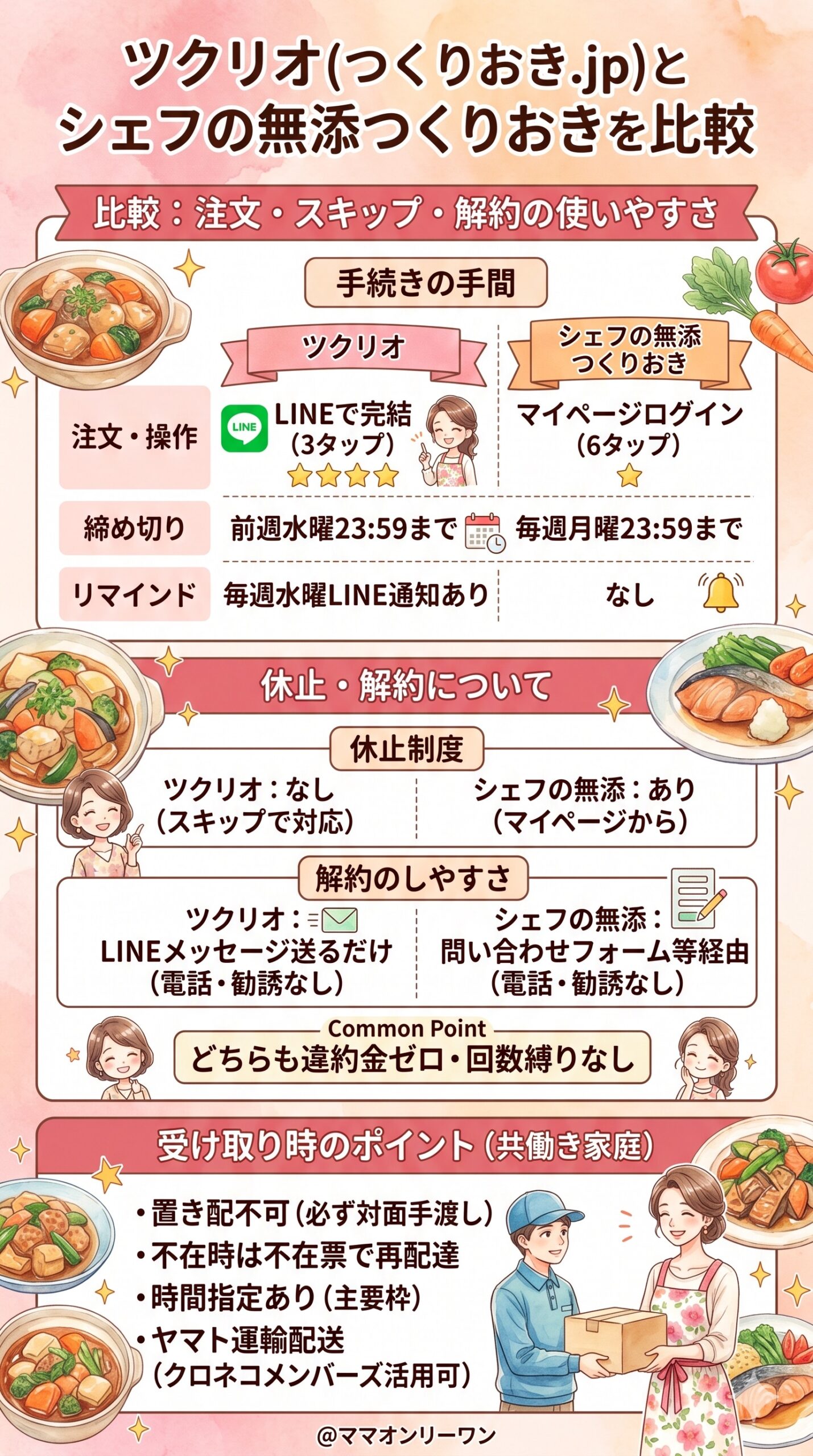シェフの無添は休止制度があるのが便利な反面、毎回マイページへのログインが必要で「めんどくさくてそのまま頼んでしまった」という声があります。ツクリオはLINEで完結するため、忙しい平日でも隙間時間に操作できる点が続けやすさに直結しています。