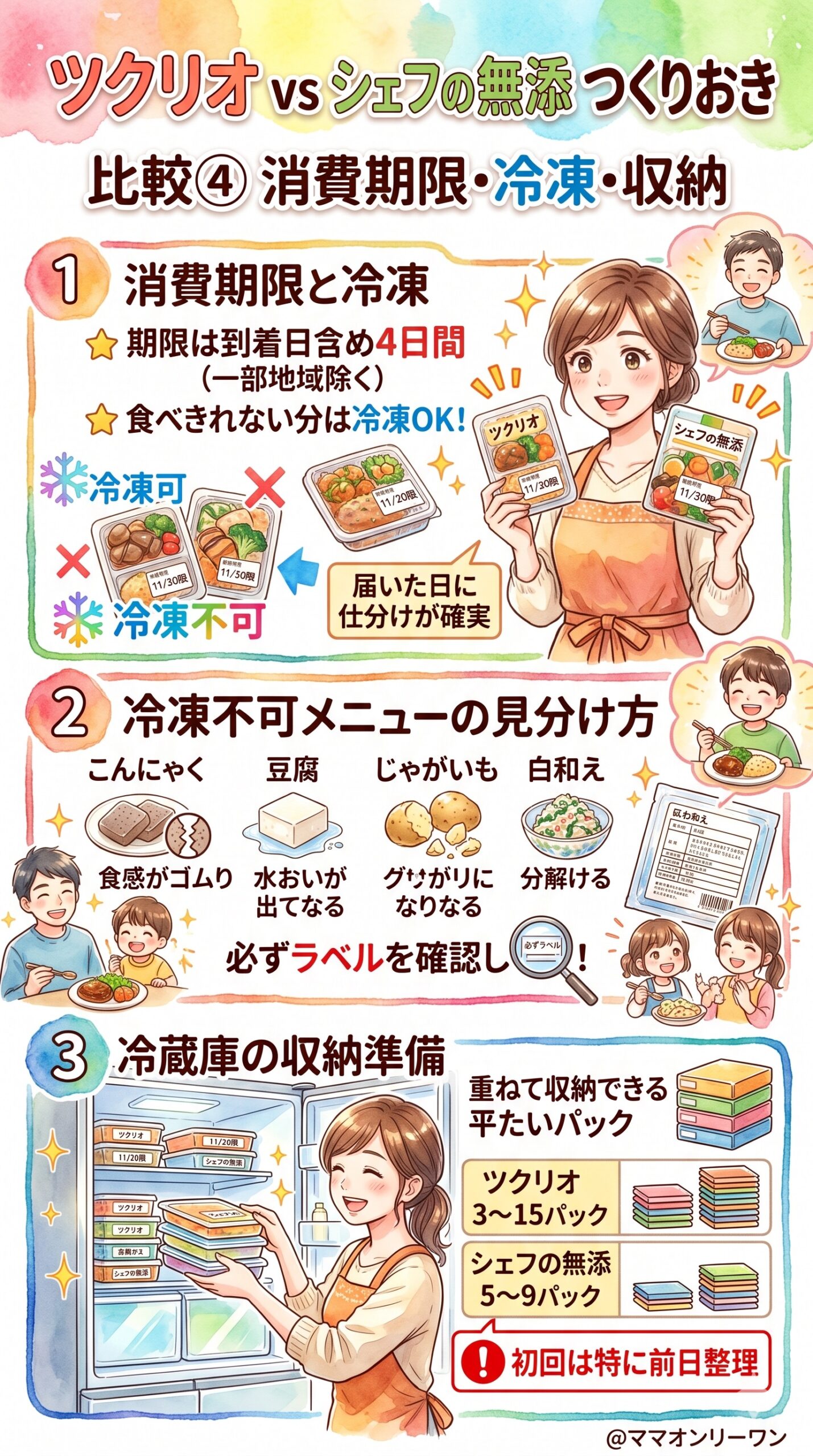 ツクリオは冷凍を前提とした設計のため、冷凍不可表示がわかりやすくラベルに記載されています。シェフの無添つくりおきは「できれば冷蔵で食べきる」を推奨していますが、冷凍可否はメモ欄で確認できます。