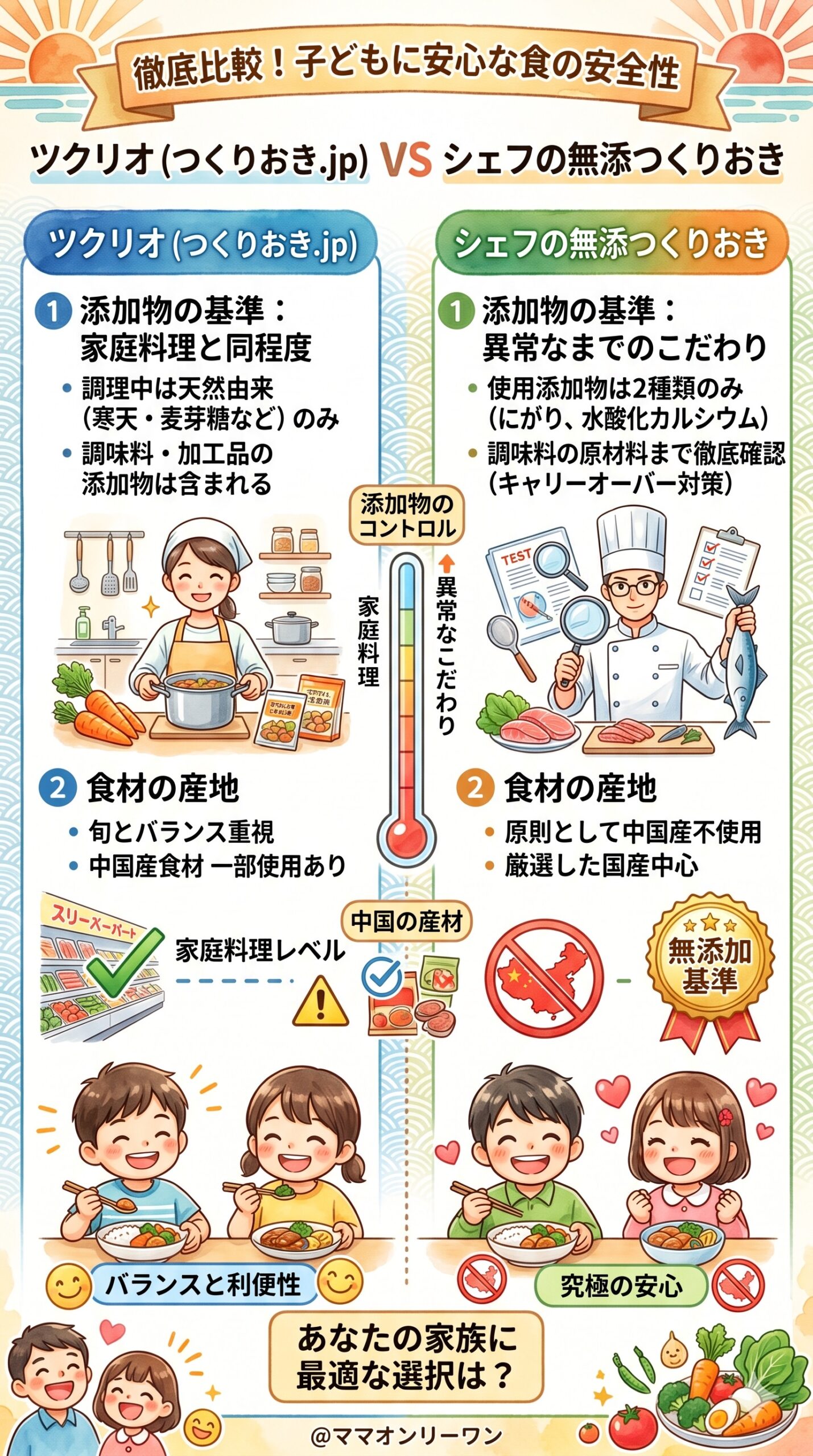 食材の安全性・無添加へのこだわりを優先するならシェフの無添つくりおき。送料と月の費用は高くなりますが、子どもに何を食べさせているかへの納得感が全然違います。