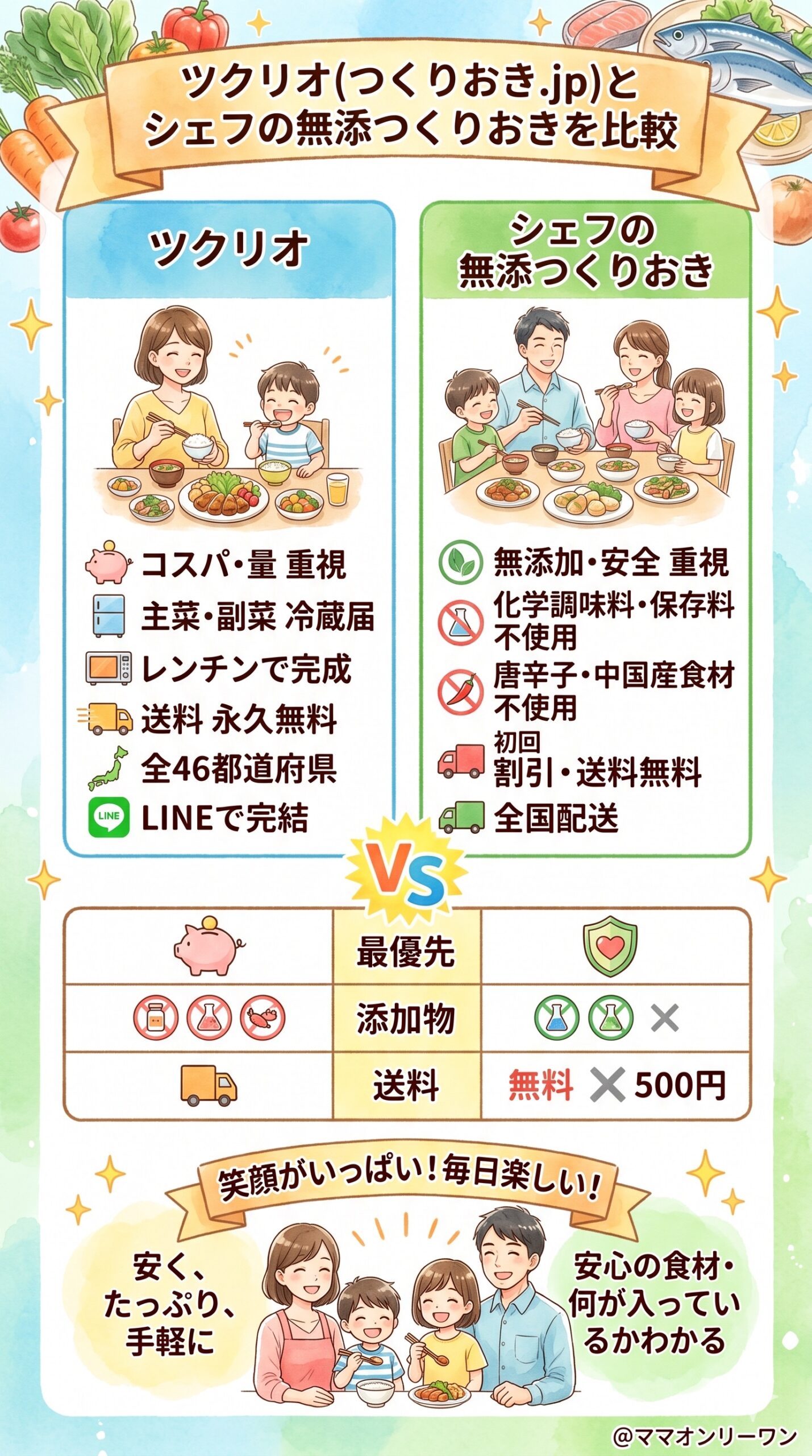 「安く、たっぷり、手軽に」を求めるならツクリオ。「何が入っているか全部わかる安心感」を求めるならシェフの無添つくりおき。この方向性の違いを最初に把握しておくだけで、後の比較がずっとわかりやすくなります。