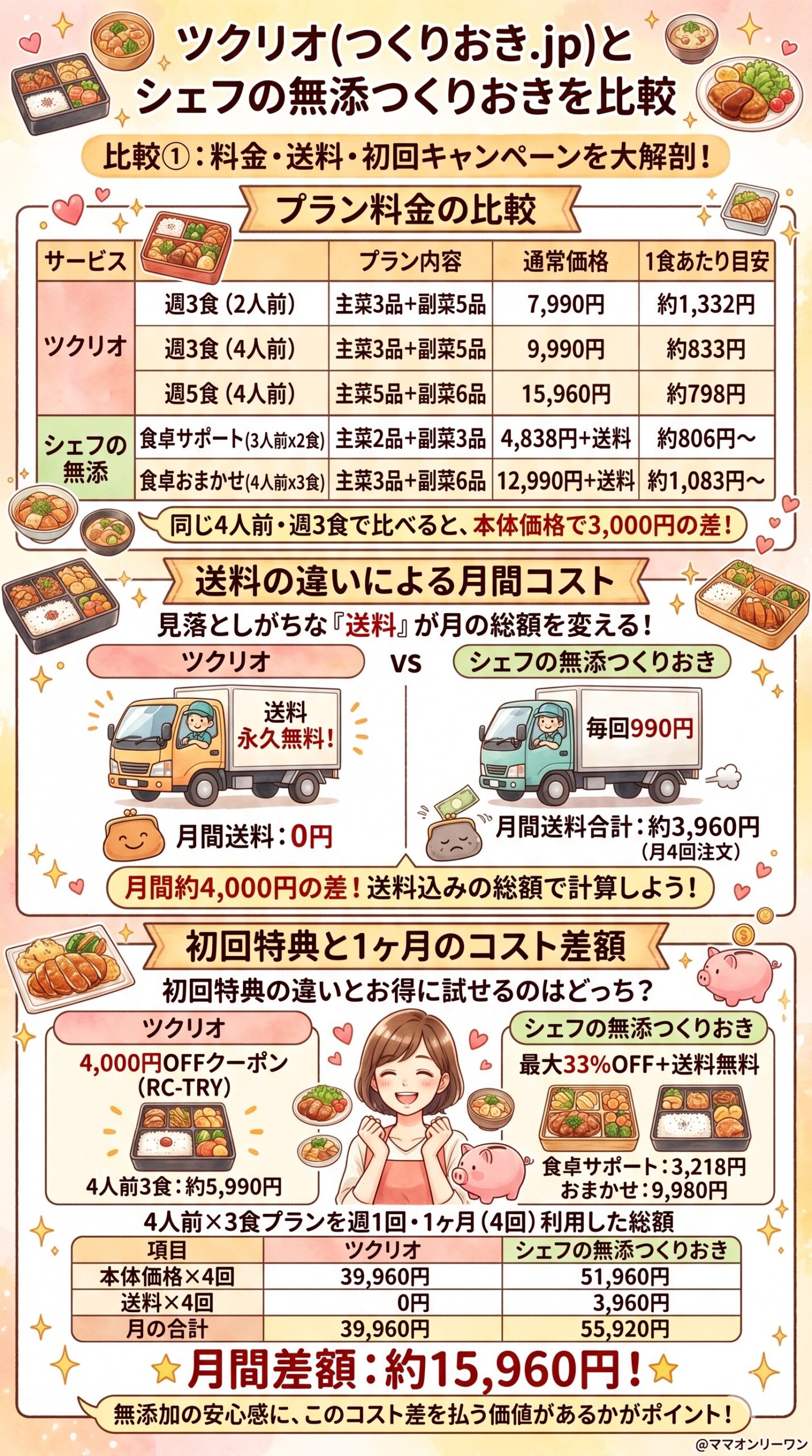 同じ「4人前×3食」で比べると、ツクリオ9,990円に対してシェフの無添は12,990円。単純な本体価格だけでも3,000円の差があります。