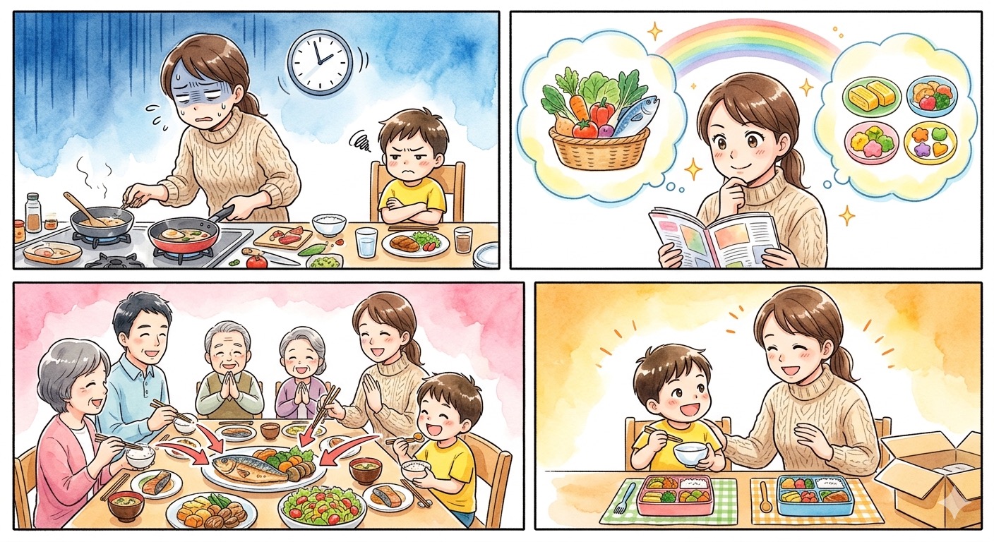 宅配食を使ったからといって、「ちゃんとしたお母さん」が崩れるわけじゃない。むしろ、夕方に余裕ができた分を子どもと話す時間に使えた家庭が、確実に存在しています。「夕食準備の30分が10分以下になった。その20分を子どもと遊ぶ時間に使えた」という変化は、数字以上の意味を持ちます。