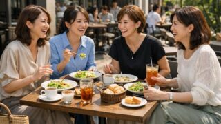 40代のママ友ランチコーデを色・素材・顔タイプ別に解説。きれいめ7割・カジュアル3割のバランスや、秋冬・春夏の実例コーデも紹介。服装選びで悩む方に役立つ内容です。